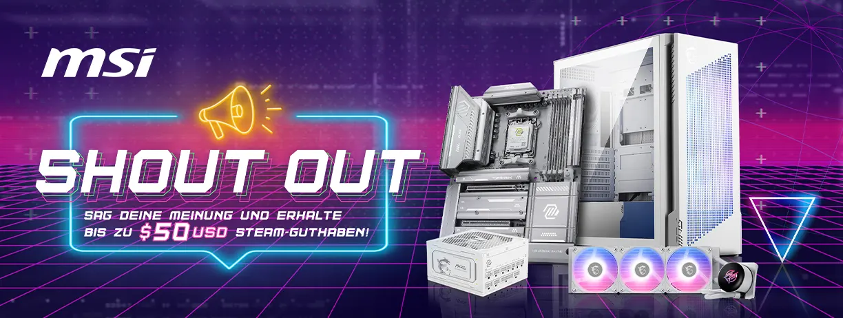 Kein Problem! Wenn du jetzt innerhalb des Shout-Out-Aktionszeitraums eines der teilnehmen MSI-Produkte kaufst und anschließend eine Rezension schreibst, erhältst du je nach Produkt einen Steam-Code im Wert von bis zu 50 USD!
