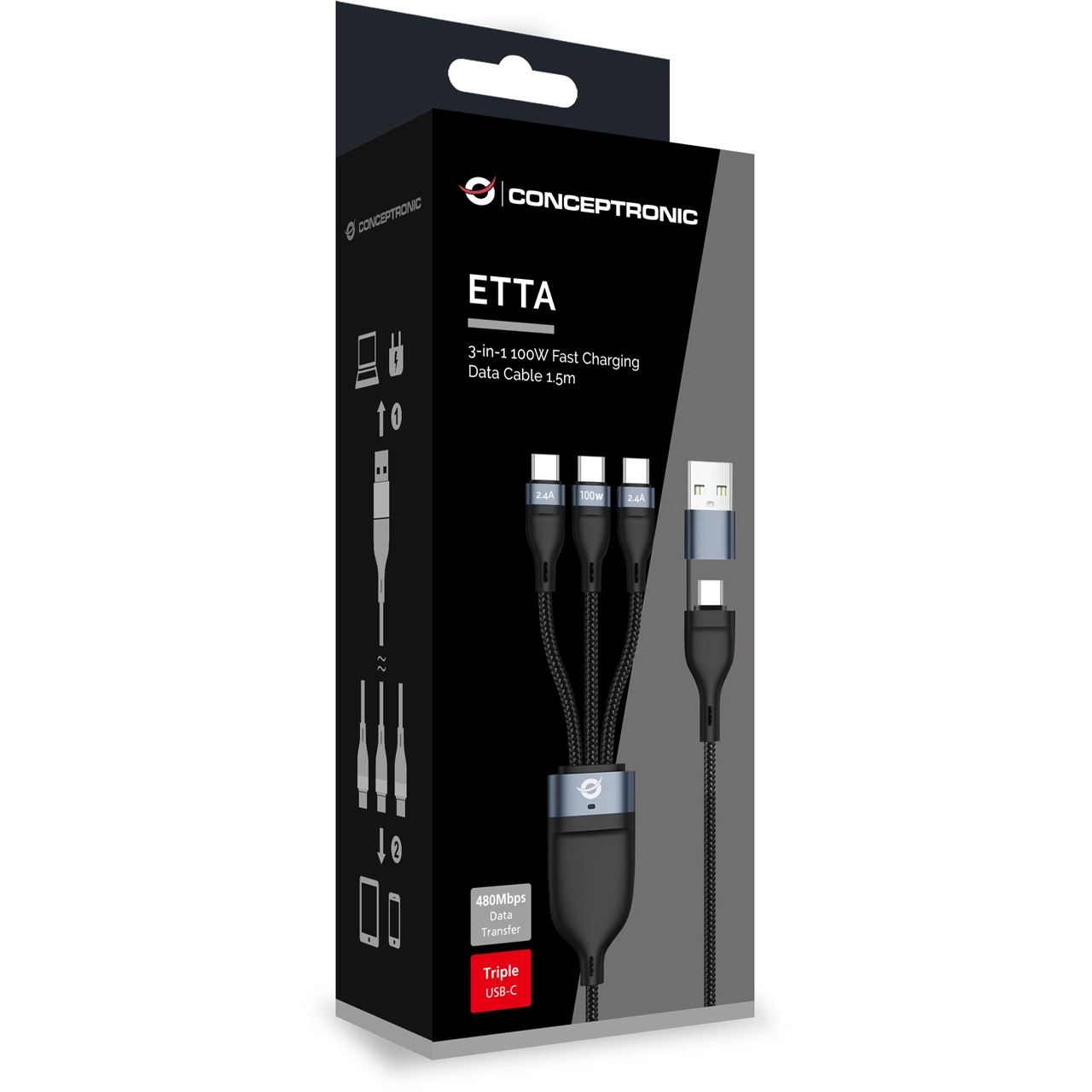 Das Conceptronic 3-in-1 USB-C-Kabel ist Ihre All-in-One-Lösung zum Laden und Synchronisieren. Drei USB-C-Stecker in einem schlanken Design sorgen für Ordnung und maximale Vielseitigkeit. Mit Power Delivery 3.0 liefert es bis zu 100W (20V/5A) Schnellladeleistung. Das hochwertige, geflochtene Kabel bedeutet dauerhafte Haltbarkeit im täglichen Einsatz. Ideal für den Arbeitsplatz, unterwegs oder überall dort, wo Sie mehrere Geräte zuverlässig und ohne Kabelsalat laden möchten.