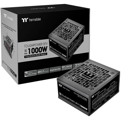 Thermaltake Toughpower SFX Platinum 1000W - TT Premium Edition. Gesamtleistung: 1000 W, AC Eingangsspannung: 100 - 240 V, AC Eingangsfrequenz: 50/60 Hz. Motherboard Anschlussstecker: 24-pin ATX, Stromkabellänge Motherboard: 30 cm, SATA-Netzkabellänge: 750,600,450,300 mm. Zweck: PC, Stromversorgungseinheit (PSU) Formfaktor: CFX, 80 Plus Zertifizierung: 80 PLUS Platinum. Produktfarbe: Schwarz, Kühlung: Aktiv, Lüfterdurchmesser: 9 cm. Sicherheit: CE/UKCA/FCC/ICES/CB/TUV/cTUVus/LVD/CCC/BSMI/ S-MARK/EAC/RCM