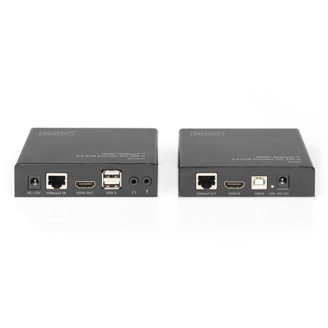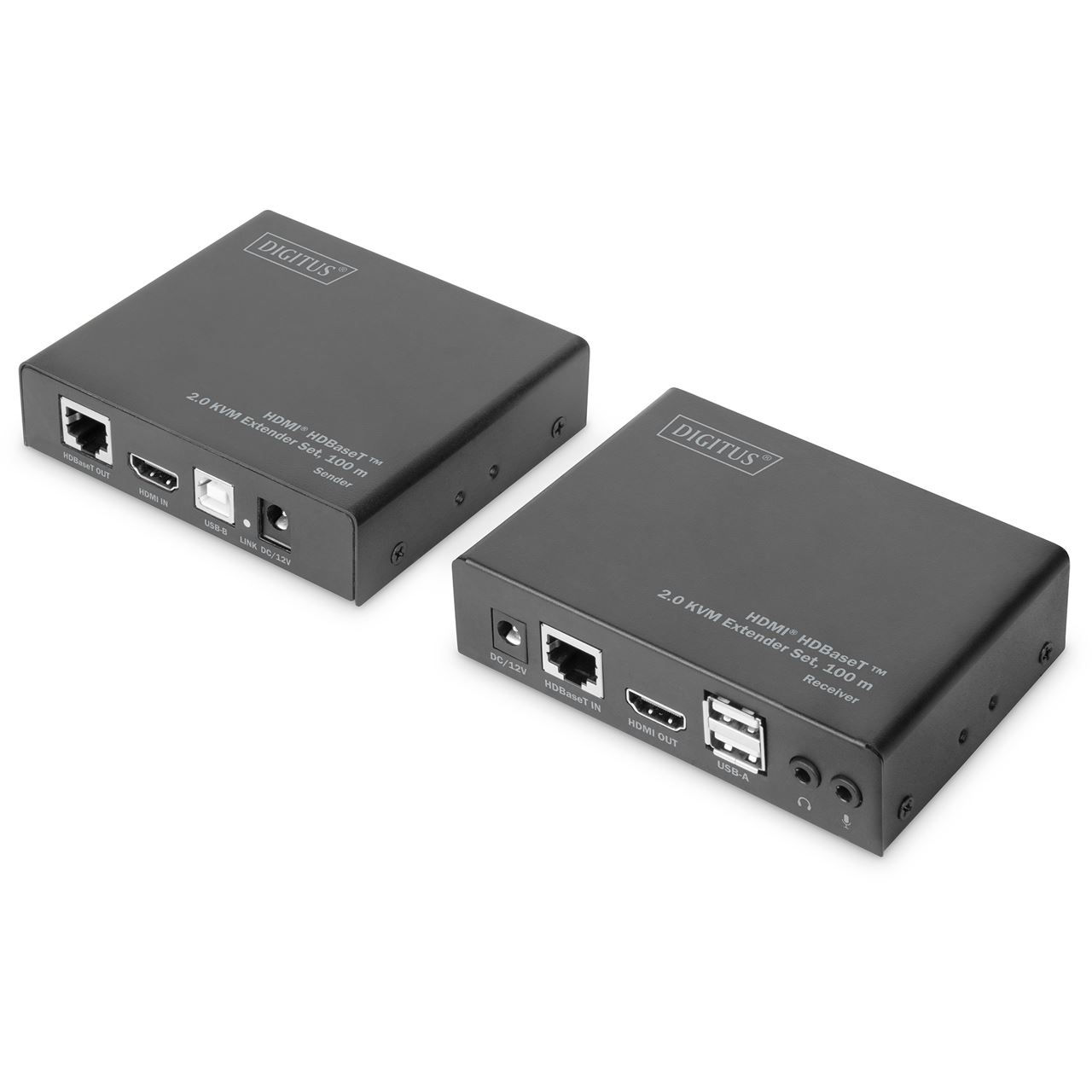 Digitus 4K HDMI HDBaseT™ 2.0 KVM Extender Set, 100 m. Typ: Sender und Empfänger, Übertragungstechnik: Kabelgebunden, Maximal mögliche Übertragungsstrecke: 100 m. Transmitter-Video-Anschlusstyp: HDMI, Transmitter lokaler Tastatur-/Maus-Anschlusstyp: USB. Empfänger lokaler Video-Anschlusstyp: HDMI, Empfänger lokale Tastatur/Maus-Anschlusstyp: USB. AC Eingangsspannung: 100 - 240 V, Eingangsstrom: 0.65 A, Netzteil Ausgangsspannung: 12 V. Breite des Senders: 13 cm, Tiefe des Senders: 1 cm, Höhe des Senders: 2,5 cm