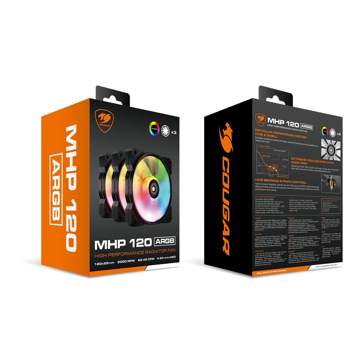 COUGAR Gaming Gehäuse Lüfter MHP 120 ARGB, Schwarz (3 in one Package). Typ: Luftkühlung, Lüfterdurchmesser: 12 cm, Luftstrom: 143,53 m³/h, Maximum Luftdruck: 4,24 mmH2O. Breite: 120 mm, Tiefe: 120 mm, Höhe: 28 mm. Produktfarbe: Schwarz, Weiß