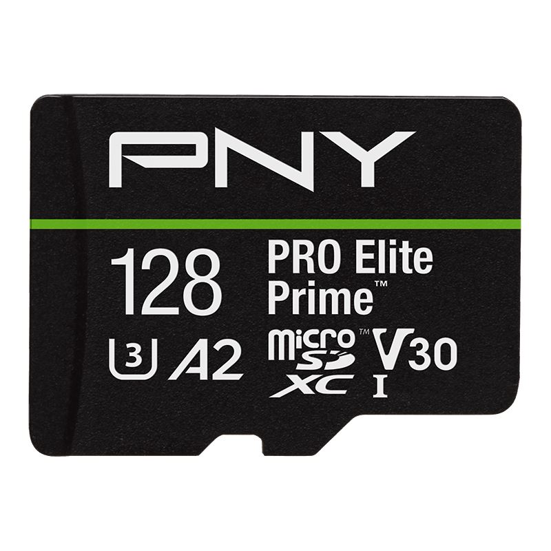 PNY PRO Elite Prime. Kapazität: 128 GB, Flash Card Typ: MicroSDXC, Flash-Memory-Klasse: Klasse 10, Interner Speichertyp: UHS-I, Lesegeschwindigkeit: 200 MB/s, Schreibgeschwindigkeit: 110 MB/s, UHS Speed Klasse: Class 3 (U3), Video-Geschwindigkeitsklasse: V30. Produktfarbe: Schwarz