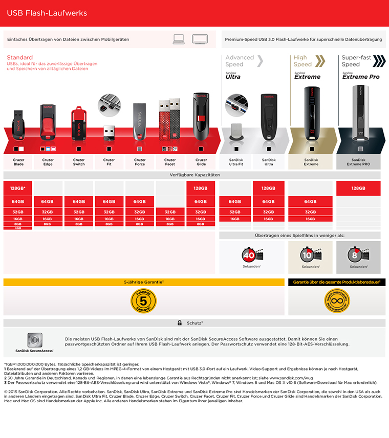 2 Passwortschutz verwendet eine 128-Bit-AES-Verschlüsselung und wird unterstützt von Windows Vista®, Windows® 7, Windows 8 und Mac OS X v10.6+ (Software-Download für Mac erforderlich, siehe www.SanDisk.com/SecureAccess).
