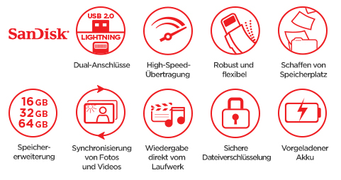 © 2015 SanDisk Corporation. Alle Rechte vorbehalten. SanDisk ist eine Handelsmarke der SanDisk Corporation, die sowohl in den USA als auch in anderen Ländern eingetragen ist. iXpand ist eine Handelsmarke der SanDisk Corporation. Apple, das Apple Logo, iPhone, iPad, Mac und Lightning sind Handelsmarken der Apple Inc., eingetragen in den USA und anderen Ländern. App Store is eine Dienstleistungsmarke der Apple Inc. Alle anderen Handelsmarken stehen im Eigentum ihrer jeweiligen Inhaber.