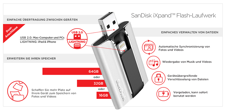 Das iXpand Flash-Laufwerk ist ideal für iPhone- und iPad-Benutzer, die ihre Fotos, Videos und sonstigen Dateien von Mobilgeräten auf Computer übertragen möchten, und das, ohne großen Aufwand. Das Laufwerk bietet schnelle Übertragungen zu Computern mit USB-Port. Damit kann man ganz schnell jede Menge Speicherplatz auf seinem Mobilgerät schaffen.