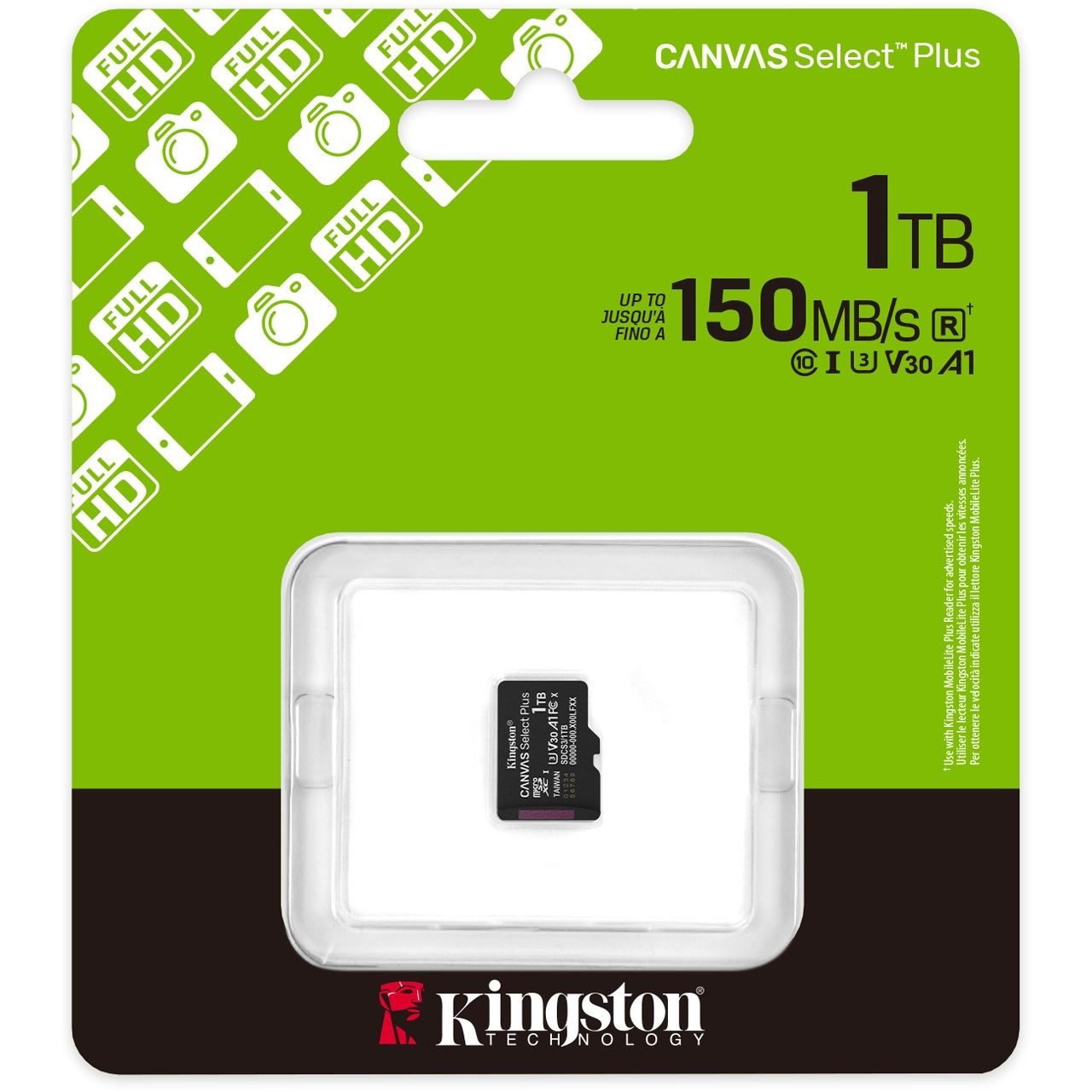 Kingston Technology 1TB micSDXC Canvas Select Plus Gen3 150R A1 (Ohne SD-Adapter). Kapazität: 1 TB, Flash Card Typ: MicroSDXC, Flash-Memory-Klasse: Klasse 10, Interner Speichertyp: UHS-I, Lesegeschwindigkeit: 150 MB/s, UHS Speed Klasse: Class 3 (U3), Video-Geschwindigkeitsklasse: V30. Produktfarbe: Schwarz