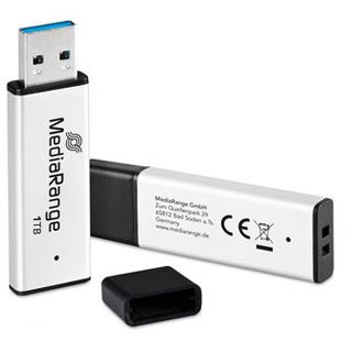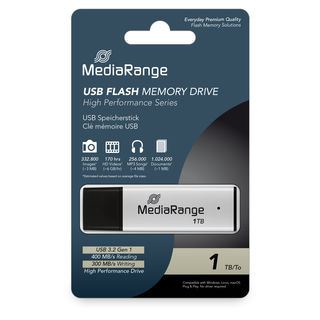 MediaRange MR1905-1. Kapazität: 1 TB, Geräteschnittstelle: USB Typ-A, USB-Version: 3.2 Gen 1 (3.1 Gen 1), Lesegeschwindigkeit: 400 MB/s, Schreibgeschwindigkeit: 300 MB/s. Formfaktor: Kappe. Gewicht: 15 g. Produktfarbe: Schwarz, Silber