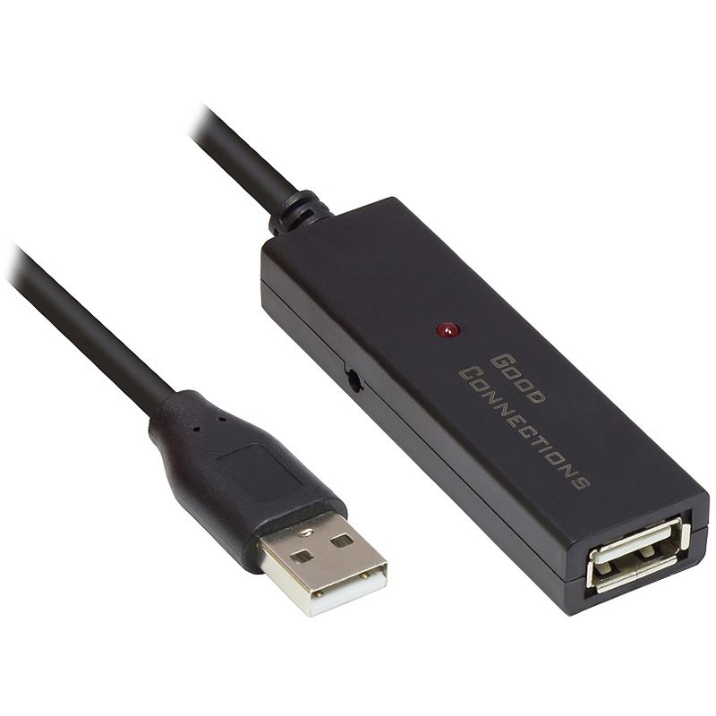 Das aktive USB 2.0 Verlängerungskabel von Good Connections verbindet ihre weit entfernten USB Geräte, wie beispielsweise ihren Drucker oder Scanner, mit Gerten die über eine USB-A Buchse verfügen, wie beispielsweise ihrem Computer oder Notebook. Der integrierte Verstärker verhindert den über längere Strecken üblichen Signalverlust und hebt so die Entfernungsbeschränkungen beim Anschluss von USB Geräten auf. Das Verlängerungskabel ist kaskadierbar, d.h. es können mehrere aktive Verlängerungen in Reihe geschaltet werden, um die USB Verbindung somit weiter zu verlängern.