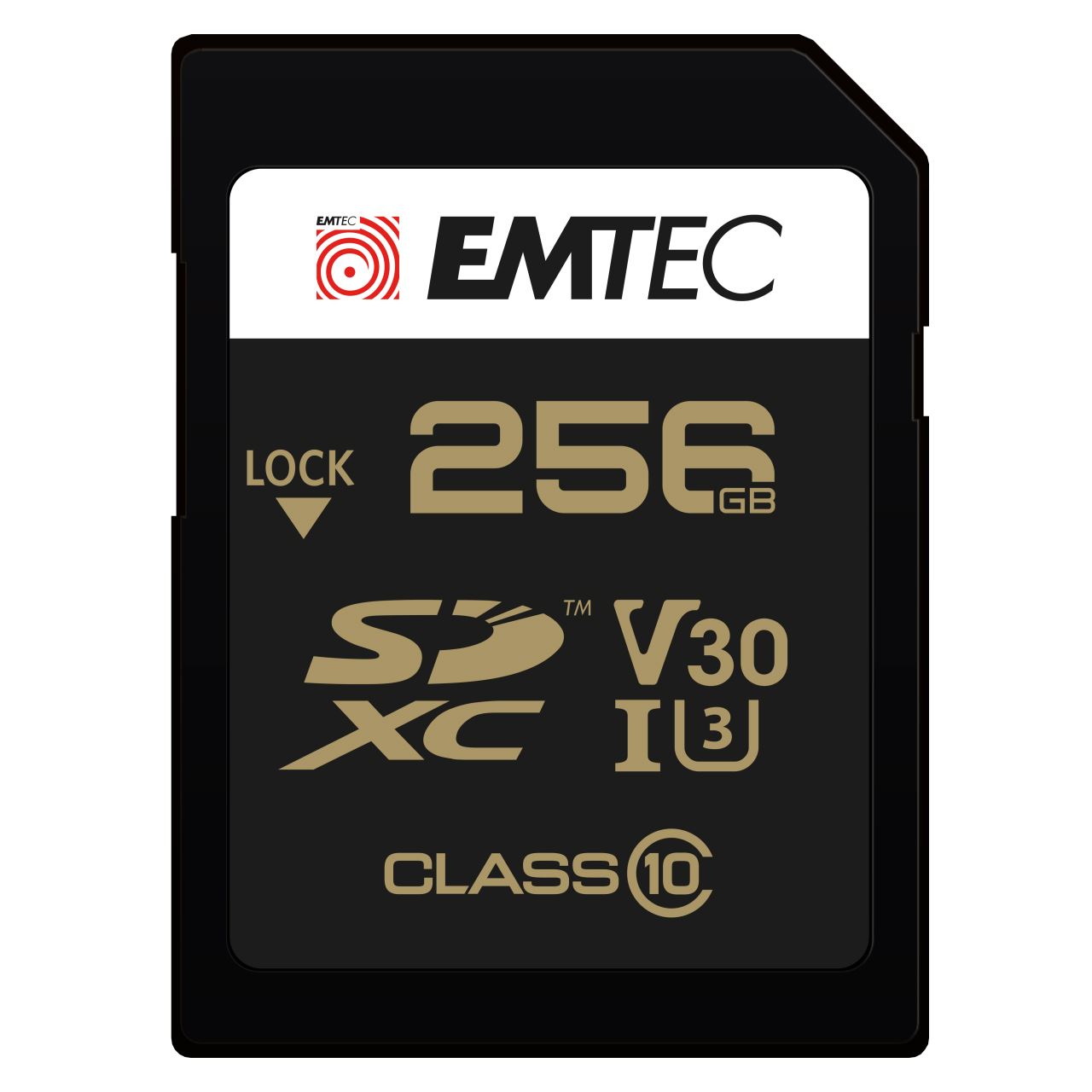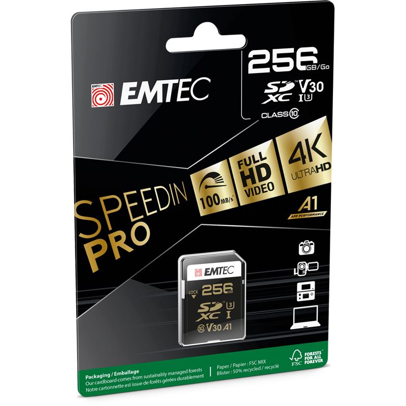 Emtec ECMSD256GXC10SP. Kapazität: 256 GB, Flash Card Typ: SDXC, Flash-Memory-Klasse: Klasse 10, Interner Speichertyp: UHS-I, Lesegeschwindigkeit: 100 MB/s, Schreibgeschwindigkeit: 50 MB/s, UHS Speed Klasse: Class 3 (U3), Video-Geschwindigkeitsklasse: V30. Produktfarbe: Schwarz