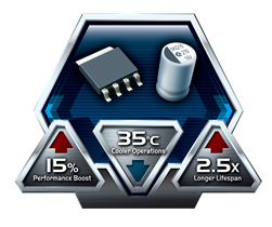Bei der Super Alloy Power-Technologie wird für die kritischen Stromversorgungskomponenten eine spezielle Legierungsformel verwendet, die eine größere Performance, niedrigere Betriebstemperaturen sowie eine längere Lebenszeit ermöglicht. Dank der festen Kerne werden lästige Brummgeräusche der Spulen verhindert, während die Kondensatoren eine Lebensdauer von bis zu 50.000 Stunden aufweisen, was in etwa 2,5mal länger ist als bei herkömmlichen Kondensatoren.