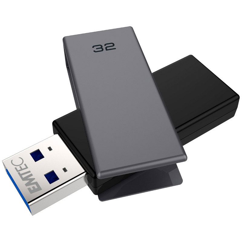Emtec C350 Brick 3.1. Kapazität: 32 GB, Geräteschnittstelle: USB Typ-A, USB-Version: 3.2 Gen 1 (3.1 Gen 1), Lesegeschwindigkeit: 20 MB/s, Schreibgeschwindigkeit: 10 MB/s. Formfaktor: Drehring, Produktfarbe: Schwarz, Silber