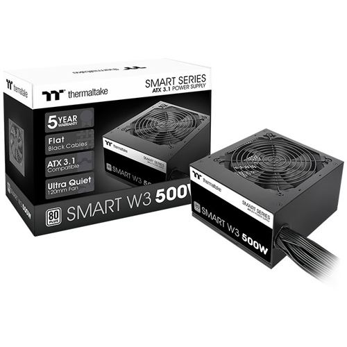 Thermaltake Smart W3. Gesamtleistung: 500 W, AC Eingangsspannung: 100 - 240 V, AC Eingangsfrequenz: 50/60 Hz. Motherboard Anschlussstecker: 24-pin ATX, Stromkabellänge Motherboard: 60 cm, SATA-Netzkabellänge: 500,650,800,950 mm. Zweck: PC, Stromversorgungseinheit (PSU) Formfaktor: ATX, 80 Plus Zertifizierung: 80 PLUS. Produktfarbe: Schwarz, Lüfterdurchmesser: 12 cm, Anzahl Lüfter: 1 Lüfter. Zertifizierung: CB/FCC/cTUVus/ICES