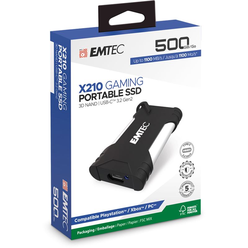 Emtec X210G. SSD Speicherkapazität: 500 GB. USB-Anschlusstyp: USB Typ-C, USB-Version: 3.2 Gen 2 (3.1 Gen 2). Lesegeschwindigkeit: 1100 MB/s. Datenübertragungsrate: 10 Gbit/s. Produktfarbe: Schwarz, Weiß