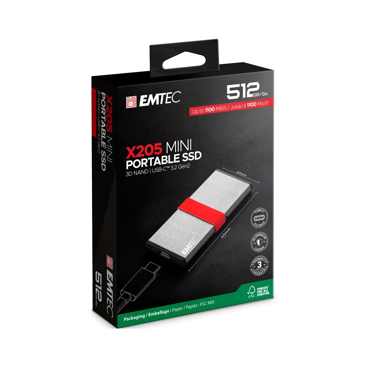 Emtec X205 Mini. SSD Speicherkapazität: 512 GB. USB-Anschlusstyp: USB Typ-C, USB-Version: USB 3.2 Gen 2x2. Lesegeschwindigkeit: 1100 MB/s. Produktfarbe: Silber