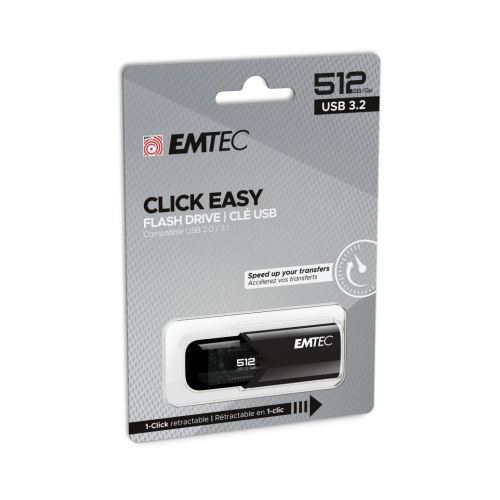 Emtec B110 Click Easy 3.2. Kapazität: 512 GB, Geräteschnittstelle: USB Typ-A, USB-Version: 3.2 Gen 2 (3.1 Gen 2), Lesegeschwindigkeit: 20 MB/s, Schreibgeschwindigkeit: 10 MB/s. Formfaktor: Dia, Produktfarbe: Schwarz