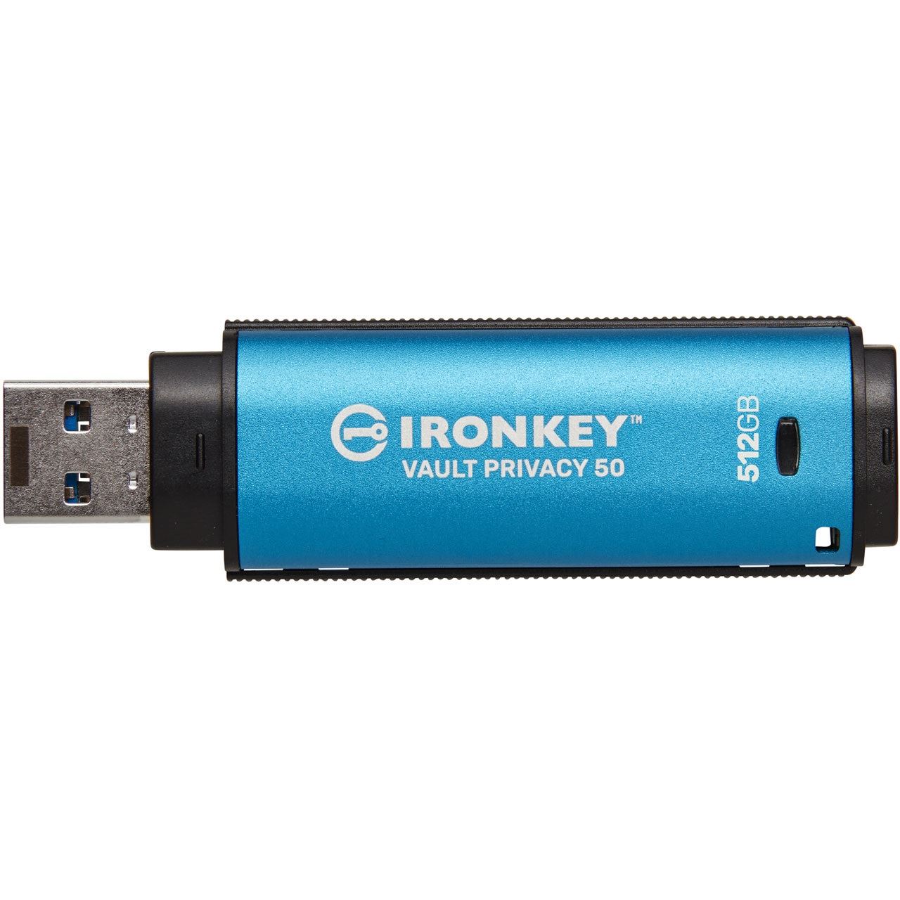 Kingston Technology IronKey 512GB Vault Privacy 50 AES-256 verschlüsselter, FIPS 197. Kapazität: 512 GB, Geräteschnittstelle: USB Typ-A, USB-Version: 3.2 Gen 1 (3.1 Gen 1), Lesegeschwindigkeit: 310 MB/s, Schreibgeschwindigkeit: 250 MB/s. Formfaktor: Kappe. Passwortschutz. Gewicht: 15 g. Produktfarbe: Schwarz, Blau