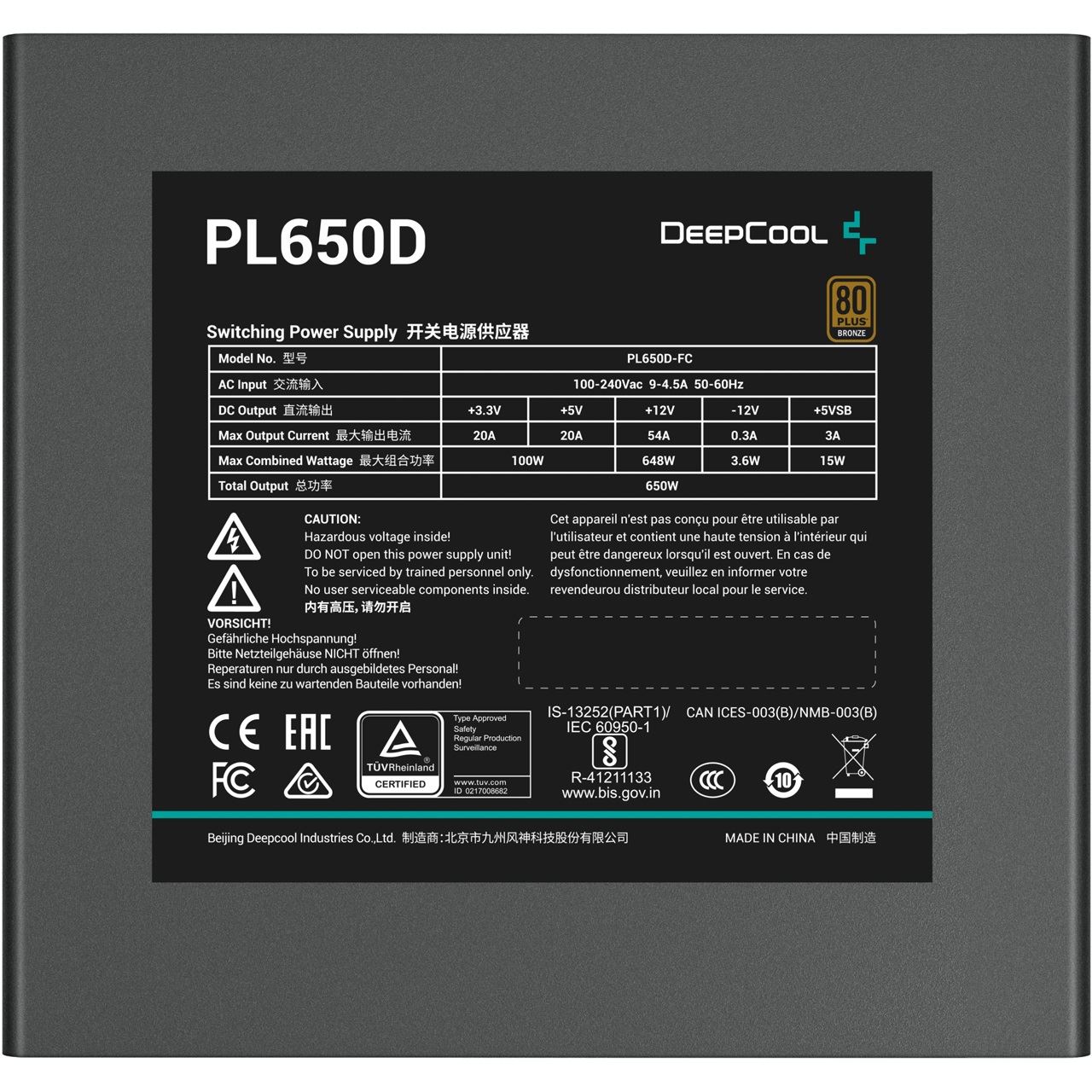 DeepCool PL650D. Gesamtleistung: 650 W, AC Eingangsspannung: 100 - 240 V, AC Eingangsfrequenz: 50/60 Hz. Motherboard Anschlussstecker: 20+4 pin ATX, Stromkabellänge Motherboard: 55 cm, SATA-Netzkabellänge: 550,450,650 mm. Zweck: PC, Stromversorgungseinheit (PSU) Formfaktor: ATX, 80 Plus Zertifizierung: 80 PLUS Bronze. Produktfarbe: Schwarz, Kühlung: Aktiv, Lüfterdurchmesser: 12 cm. Konformitätsbescheinigungen: RoHS, WEEE, Zertifizierung: CE/FCC/CCC/RCM/EAC/CAN ICES-003(B)/NMB-003(B) /TUV-RH