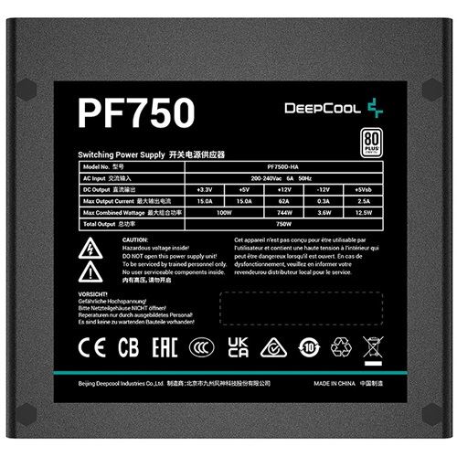 DeepCool PF750. Gesamtleistung: 750 W, AC Eingangsspannung: 230 V, Effizienz: 85%. Motherboard Anschlussstecker: 20+4 pin ATX, Stromkabellänge Motherboard: 55 cm, SATA-Netzkabellänge: 450 mm. Zweck: PC, Stromversorgungseinheit (PSU) Formfaktor: ATX, 80 Plus Zertifizierung: 80 PLUS White. Produktfarbe: Schwarz, Kühlung: Aktiv, Lüfterdurchmesser: 12 cm. Zertifizierung: CB/CCC/CE/UKCA/EAC/RCM