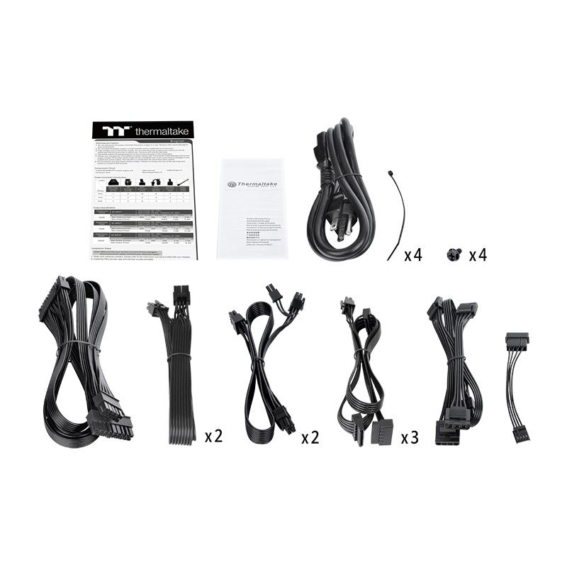 Thermaltake Toughpower PF1. Gesamtleistung: 850 W, AC Eingangsspannung: 100 - 240 V, Spitzenstrom: 900 W. Motherboard Anschlussstecker: 24-pin ATX, Stromkabellänge Motherboard: 60 cm, SATA-Netzkabellänge: 150,500 mm. Stromversorgungseinheit (PSU) Formfaktor: ATX, 80 Plus Zertifizierung: 80 PLUS Platinum, Geräuschpegel: 27,8 dB. Produktfarbe: Schwarz, Lüfterdurchmesser: 12 cm, Anzahl Lüfter: 1 Lüfter. Mitgelieferte Kabel: AC, CPU, PCIe, Peripheral (Molex), SATA