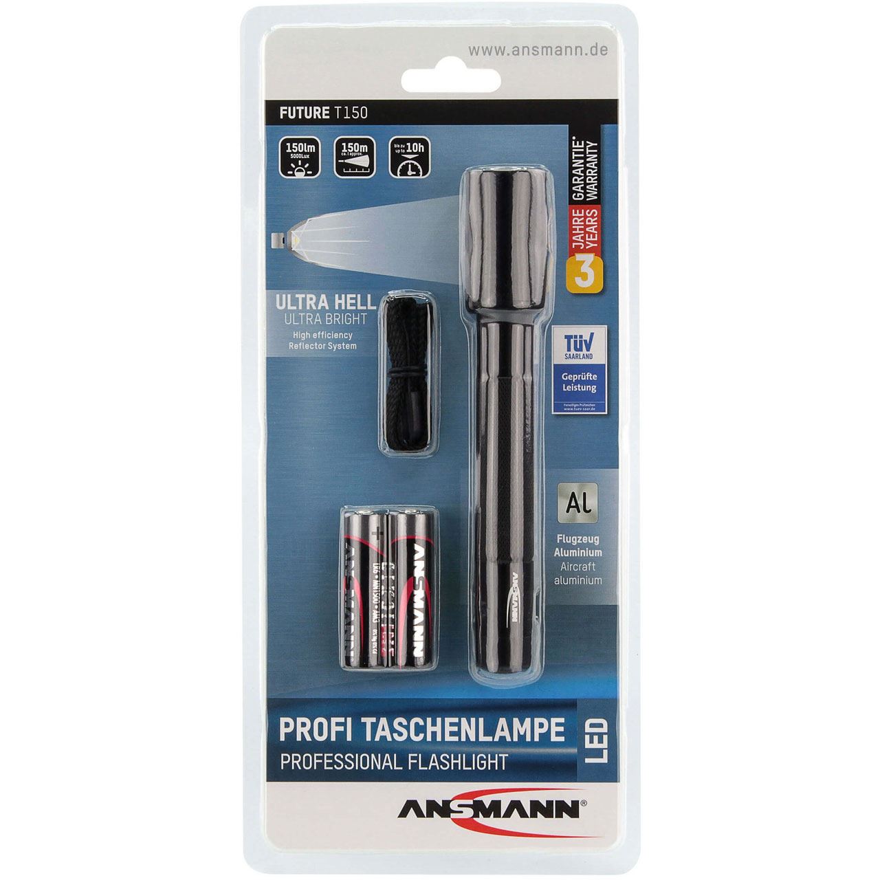 Ansmann 1600-0145. Taschenlampen Typ: Taschenlampe, Produktfarbe: Schwarz. Stoßfest bis zu: 1 m, Internationale Schutzart (IP-Code): IP54. Lampentyp: LED, Anzahl Lampe(n): 1 Lampen, Lichtleistung: 150 lm. Akku-/Batterietyp: AA, Batteriereichweite: 10 h. Breite: 25 mm, Tiefe: 25 mm, Höhe: 156 mm