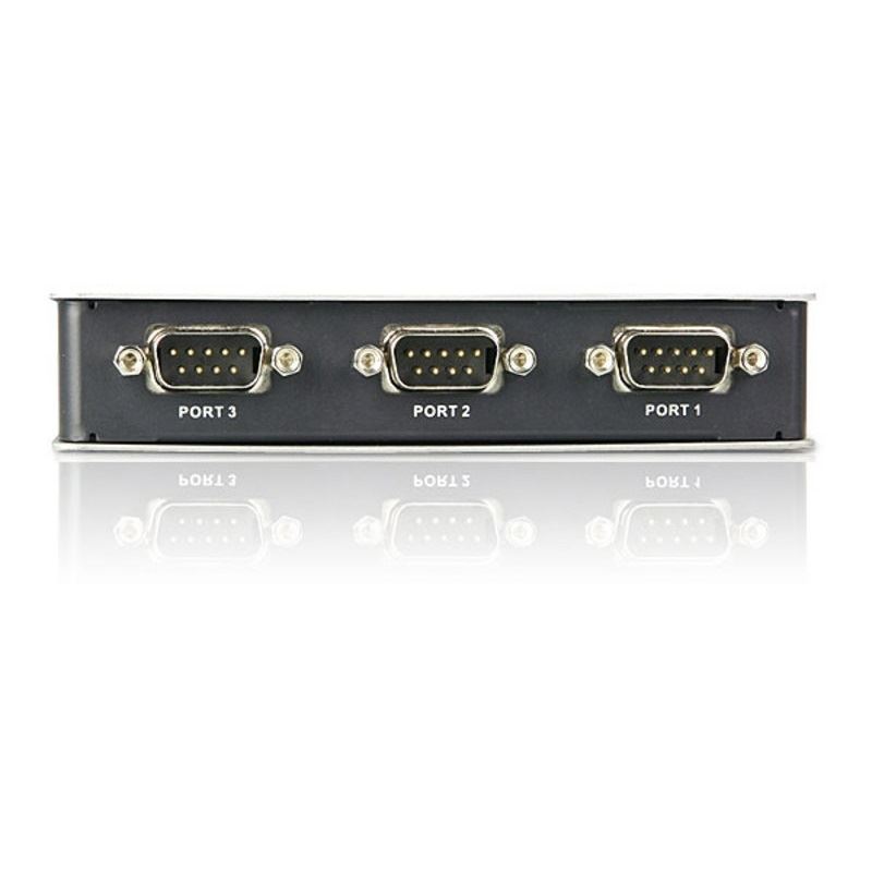 4-Port-Hub mit Konverter für USB- auf serielle RS-232-Schnittstelle. Der Hub mit Konverter für USB- auf serielle RS-232-Schnittstelle von ATEN stellt Computern, Notebooks, Laptops und Handheld-Geräten, die dem USB-Standard entsprechen, eine externe, serielle Plug-and-Play-fähige Anschlussmöglichkeit zur Verfügung. Er ist eine schnelle, einfache und kostengünstige Lösung, wenn es um Kommunikations- und Automatisierungsanwendungen geht.Geräteanschlüsse: 41x USB Typ B Buchse (weiß)Seriell: 4 x DB-9 Stecker (schwarz)Stromversorgung: 1x StromeingangsbuchseLED-Anzeigen:Port-Zustand: 4 (grün)Betrieb: 1 (orange)Datenübertragungsgeschwindigkeit: 115,2 Kbps (max.)USB-Spezifikation: Kompatibel zu USB 1.1 und USB 2.0RS-232-Signal: TXD, RXD, RTS, CTS, DTR, DSR, DCD, RI, GNDDatenbits: 5, 6, 7, 8Stoppbits: 1, 1,5, 2 Stromversorgung: Stromversorgung über Bus, die Speisung über ein Netzteil ist optionalStromverbrauch: 0,6 W Betriebstemperatur: 0 - 50 °CLagertemperatur: -20 - 60 °CFeuchtigkeit: 0-80% rel. Luftfeuchte, nicht kondensierendGehäuse: MetallGewicht: 0,32 kgAbmessungen (L x B x H): 12,50 x 8,15 x 2,50Lieferumfang: 1x Hub mit Konverter von USB- auf serielle Schnittstelle, 1x USB-Kabel, 1x Installations-Disk, 1x Benutzerhandbuch