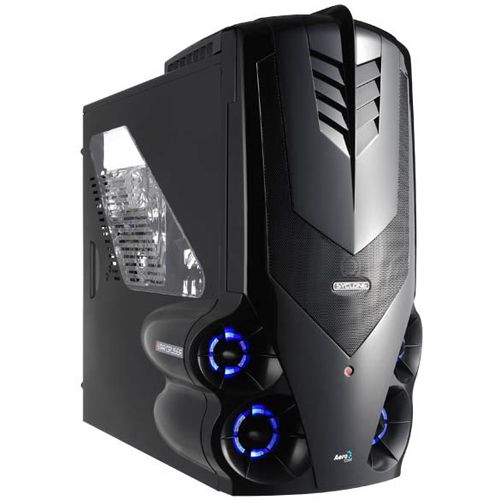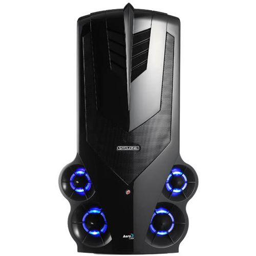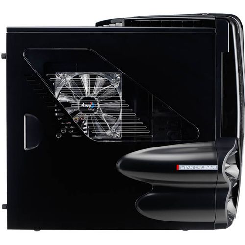 Die Laufwerke werden in drei Schächten verstaut, wobei der obere vier 5,25“ (13,34cm) Slots bereitstellt und die unteren beiden jeweils drei 3,5“ (8,89cm) Slots. Zur einfachen Bestückung sind die HDD-Schächte zur Seite gedreht und erlauben eine Laufwerksbefestigung ohne Werkzeug. Zusätzlich ist der obere 3,5“ (8,89cm) Schacht ausbaubar. Damit bietet er die Möglichkeit, besonders lange Grafikkarten verbauen zu können. In dem linken Seitenteil befindet sich ein Fenster. Darin sind Belüftungsschlitze eingelassen, hinter denen ein LED-Lüfter installiert werden kann. Es ist ein interessanter Kontrast zur schwarzen Lackierung, die den Großteil des Midi-Towers prägt. Die Belüftung übernehmen im Auslieferungszustand ein 140mm Lüfter hinter der Front sowie ein 120mm Lüfter an der Rückseite. Im vorderen Deckelbereich befindet sich das I/O-Panel mit zwei USB, einem eSATA und zwei Audio Anschlüssen.