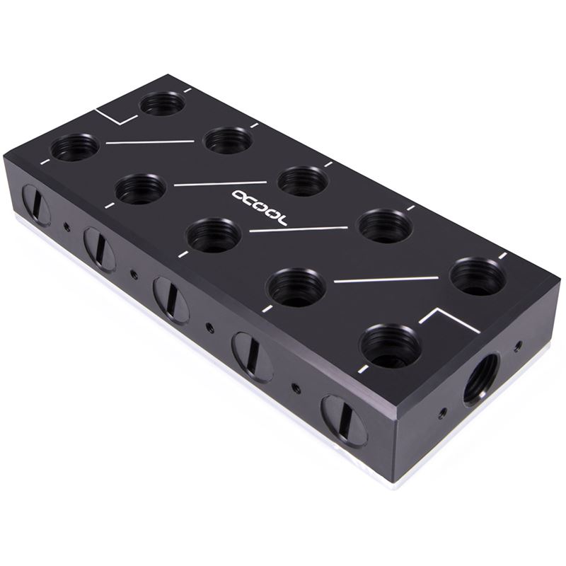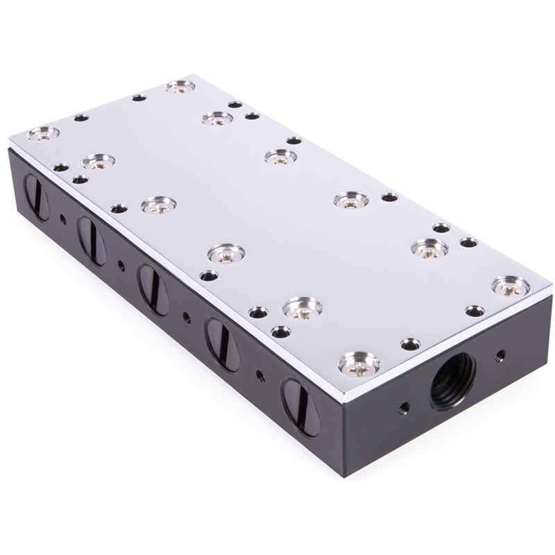 Die Alphacool ES Distro Plates sorgen für Ordnung im System und erleichtern den Austausch von Komponenten im Zusammenspiel mit Schnellverschlüssen. Sie bieten umfangreiche Montagemöglichkeiten und sind die ideale Grundlage für jedes Enterprise System das mit einer Wasserkühlung ausgestattet werden soll. Montagemöglichkeiten Die ES Distro Plates lassen sich vielseitig montieren. Die einfachste und schnellste Variante ist die Montage über den beiliegenden selbstklebenden Klettverschluss. Dabei wird eine Seite direkt an die Distro Plate geklebt, die andere Seite an eine beliebige Stelle im Gehäuse. Danach kann man die Distro Plate einfach auf den Klettverschluss draufsetzen. Im Lieferumfang sind spezielle Füße und Montagerahmen enthalten, die mehrere Einbauoptionen bieten. Mit dem Montagezubehör lässt sich die Distro Plate an jeden 120 oder 140 mm Lüfterplatz montieren. Die beiliegenden Füße bieten ebenfalls viele Montageoptionen, darunter auch eine Vertikale Montagemöglichkeit an einem einzelnen Fuß. Diverse Gewindebohrungen auf den Seiten und auf der Rückseite der ES Distro Plate bieten weitere direkte Montagemöglichkeiten, darunter auch angepasste Bohrungen für spezielle Montageschienen in den Serverracks von Alphacool. Anschlussmöglichkeiten Die ES Distro Plate C5 besitzt insgesamt 22 Anschlussmöglichkeiten im Format G1/4 mit 5mm tiefen Gewinden. Davon befinden sich jeweils 5 Anschlüsse auf jeder langen Seite, 10 auf der Oberseite und jeweils ein Anschlussgewinde an jeder Stirnseite. Man muss jedoch beachten, dass alle Anschlüsse Paarweise angelegt sind. Man kann also nur den oberen oder den seitlichen Anschluss verwenden. Die Ausnahme bilden zwei jeweils drei Anschlussmöglichkeiten an den Stirnseiten. Hier kann jeweils nur der seitliche, obere oder der Anschluss an der Stirnseite verwendet werden. Die genauen Möglichkeiten werden in der Anleitung bildlich dargestellt. Durch diese Konfiguration können alle Komponenten im Wasserkreislauf sehr leicht mit der Distro Plate verbunden werden. Natürlich lassen sich auch mehrere ES Distro Plates in Reihe zusammenschließen. Wozu eine ES Distro Plate? Besonders in engen Servergehäusen ist es unerlässlich einen sauberen Aufbau der Wasserkühlung zu ermöglichen. Wer sich den Wasserkreislauf vorher einmal aufzeichnet, wird schnell den idealen Platz für die Distro Plate finden. Ein idealer Platz ist, wenn alle Schläuche möglichst gerade verlegt werden können. Denn zu engen Biegeradien sollten bei Schläuchen vermieden werden. Wenn Komponenten ausgetauscht werden sollen, ist die Verwendung der Alphacool ES Schnellverschlüsse mit Außengewinde zu empfehlen. So können alle Komponenten im Kreislauf direkt an der Distro Plate mit Schnellverschlüssen montiert werden. Dadurch ist der Austausch von z.B. einem oder mehrere Kühler sehr schnell möglich. Auch weitere oder größerer Radiatoren lassen sich leicht einbinden bzw. austauschen. Technische Daten: L x B x H 56 x 130 x 22,5 mm Material Oberseite Acetal Material Unterseite Vernickeltes Kupfer Anschlüsse 22 x G1/4“ Download Datenblatt PDF: Alphacool ES Distro Plate C5 Download Anleitung PDF: Alphacool ES Distro Plate C5