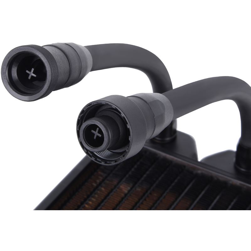 Die adressierbaren digitalen RGB-LEDs sind direkt in den Kühlblock eingelassen und sie verlaufen seitlich an dem ganzen Kühlblock entlang. Der Effekt ist eine Beleuchtung, die den gesamten Kühlblock einschließt. Keine Ecke oder Kante bleibt durch die aRGB LEDs unbeleuchtet. Das neue Design ist kantiger, wobei alle Kanten abgeschrägt sind. Die Folge ist eine bessere Lichtstreuung im Wasserkühler durch die Reflektionen an diesen Schrägen. Außerdem erzeugen sie diverse Konturen, die dem Eisblock Aurora Acryl GPX Kühler eine ganz eigene optische Note geben.