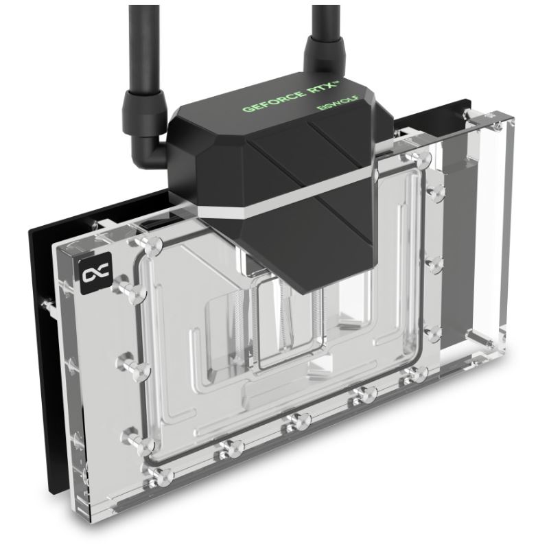 Der Eiswolf 2 Grafikkarten AIO Wasserkühler kühlt nicht nur die GPU mit Wasser sondern alle relevanten Bauteile die eine aktive Kühlung benötigen. Dazu gehören der Grafikspeicher, die Spannungswandler und gegeben falls noch weitere Bauteile die zwingend eine direkte Kühlung benötigen. Durch die Verwendung des Eisblock GPX Aurora Wasserkühlers als Basis, ist die Kühlleistung identisch mit der eines DIY Grafikkarten Wasserkühlers
