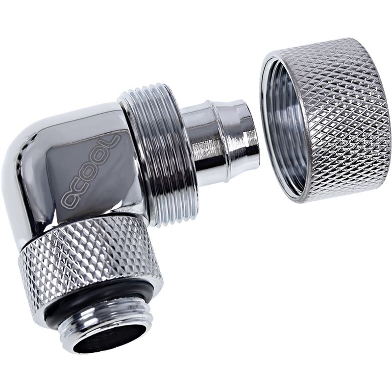 Silberner 90-Grad-Winkel-Adapter aus der Alphacool Eiszapfen-Serie, mit drehbarem G1/4-Zoll-Gewinde, für Schläuche mit 16/10 mm OD/ID, komplett aus Messing