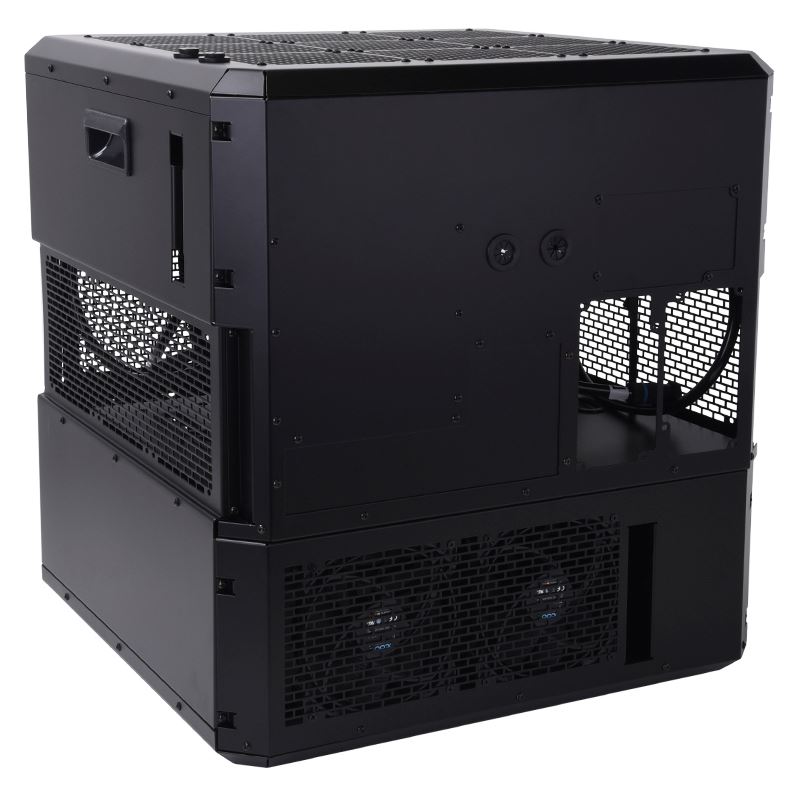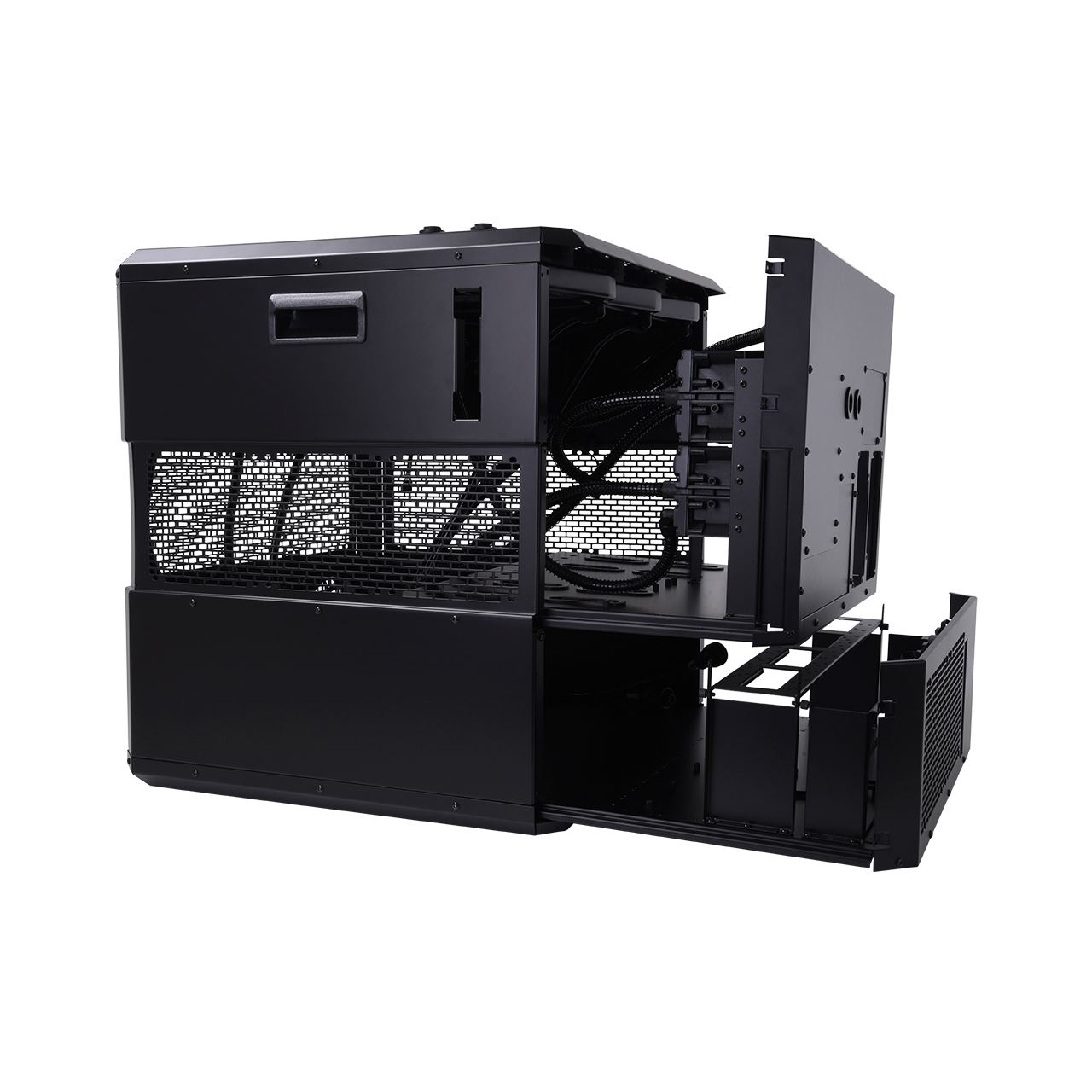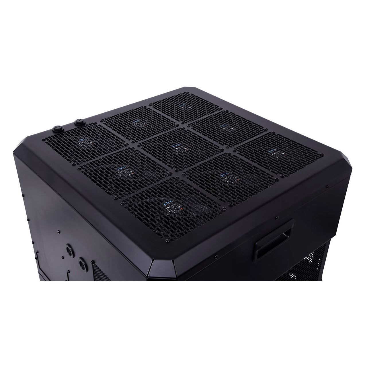 Der Alphacool Mining Cube bietet eine Vielzahl von Optionen für die Einrichtung eines leistungsstarken Wasserkühlsystems. Ob als Workstation, Render-Master oder Mining-System - der Alphacool Mining Cube ist dank der umfangreichen Montagemöglichkeiten sehr vielseitig einsetzbar.nbsp; Was passt in den Cube? Neben einem Mini-oder Micro-ATX-Motherboard können bis zu drei ATX-Netzteile installiert werden. Das Mainboard ist in der oberen Ebene montiert, während sich im unteren Bereich eine Schublade zur Montage von Grafikkarten befindet. Auf der Unterseite der Schublade befinden sich umfangreiche Befestigungslöcher für Riser-Boards mit PCIe-Steckplätzen. Alternativ können bis zu 9 einzelne Riser-Karten miteinander verschraubt, werden. Eine Halteklammer fixiert die Grafikkarten in der richtigen Position, damit beim Transport nichts verrutschen kann. Für den Transport sind Haltegriffe an der Oberseite des Gehäuses angebracht. Wasserkühlung? Insgesamt besteht die Möglichkeit, bis zu sieben 420 mm Heizkörper einzubauen. Alternativ können insgesamt bis zu 23 Lüfter mit einer Größe von 140 mm montiert werden. Zwei Ventilatoren sitzen vorne in der Schublade und blasen direkt auf die Grafikkarten. Im Inneren befinden sich spezielle Montagehalterungen für das Alphacool Eisfach. Um das Befüllen der Wasserkühlung zu erleichtern, befindet sich oben am Gehäuse eine Fülldüse. Damit die Luft beim Befüllen leichter entweichen kann, wurde direkt daneben eine Entlüftung eingesetzt. Beide können problemlos an die im Deckel montierten Heizkörper angeschlossen werden. Teile des Wasserkühlsystems sind vormontiert! Der Mining Cube 300 hat bereits einzelne Komponenten vormontiert. Darunter befinden sich drei 420-mm-Heizkörper mit 9 vormontierten 140-mm-Lüftern. Zwei weitere Lüfter sind im unteren Teil auf der Rückseite montiert. Die 140-mm-Lüfter können alle per PWM mit einer maximalen Drehzahl von 1300 U / min gesteuert werden. Es sind auch zwei Eisfach-Vorratsbehälter vormontiert, von denen jeder für die Installation einer DDC-Pumpe vorbereitet ist. Damit haben Sie eine gute Grundlage für die Ausstattung des Systems mit einer umfangreichen Wasserkühlung. Der Alphacool Mining Cube 300 ist ein einzigartiges Produkt, das in dieser Form bisher noch nicht auf dem Markt erhältlich war. Einzigartig sind die zahlreichen Montagemöglichkeiten die für eine extrem leistungsstarke Wasserkühlung sorgen. nbsp;