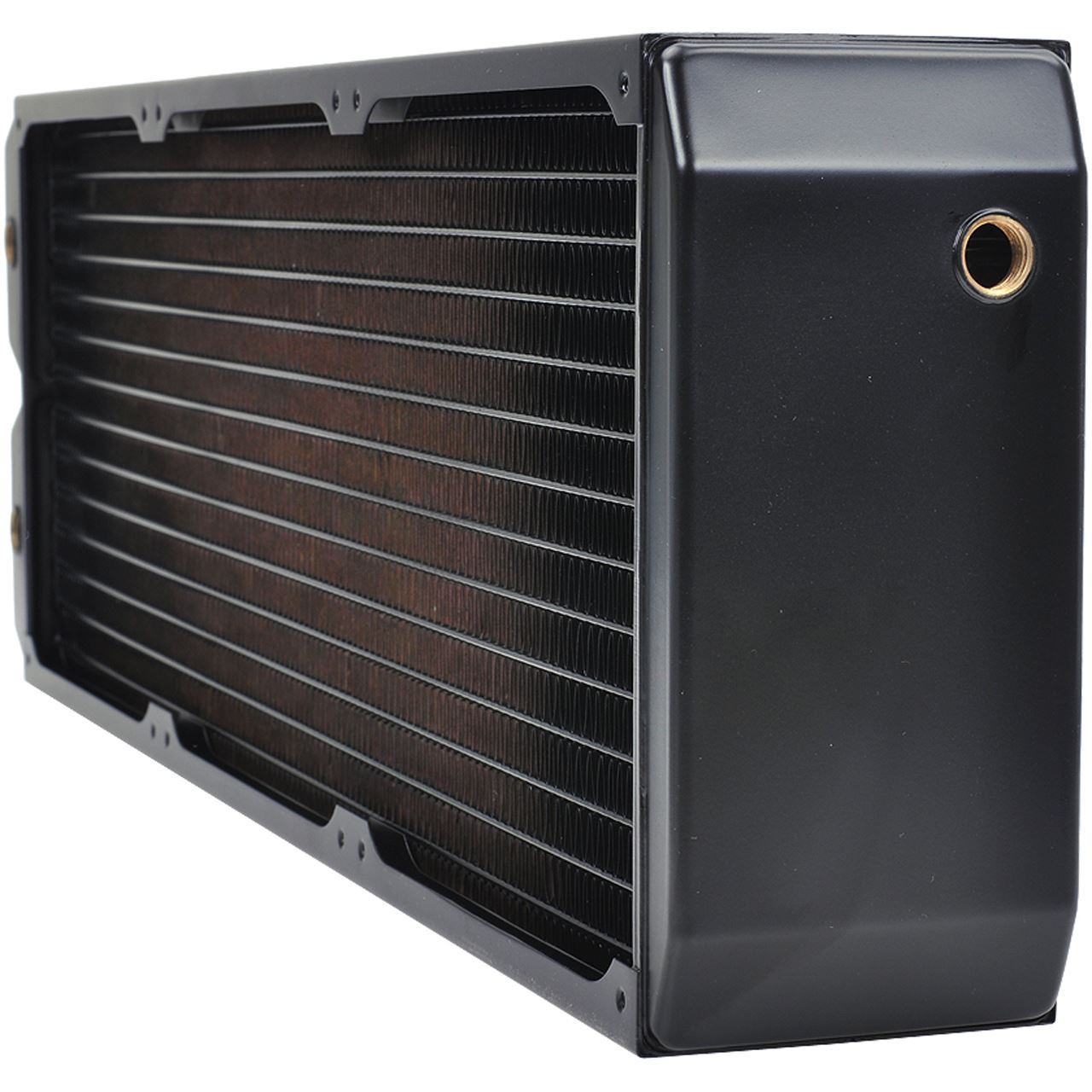Der weltweit bekannte Hersteller Alphacool ist aktuell der einzige Hersteller weltweit der bei allen wasserführenden Teilen auf reines Kupfer setzt. Die Vorkammern, Wasserkanäle und die Finnen sind alle aus reinem Kupfer. Dadurch bieten Alphacool Radiatoren die höchste Wärmeleitfähigkeit, wodurch das Leistungslimit deutlich höher liegt als bei Aluminium Radiatoren. Kurz gesagt, die Kühlleistung ist schlichtweg höher, wenn man sehr viel Wärme abführen möchte. Kupfer ist im Wasserkühlungsbereich seit Jahren die beste Wahl bei den Materialien. Alle Alphacool Radiatoren sind für den Silent Betrieb ausgelegt. Sie benötigen also keine Lüfter mit besonders hohem statischen Druck, um die gewünschte Performance zu erzielen, sondern können auf normale Lüfter mit niedriger Drehzahl setzen. Der Performanceverlust gegenüber speziellen Lüftern für Radiatoren ist dadurch geringfügig und kann normalerweise ignoriert werden. Wer natürlich die maximale Kühlleistung erreichen will und auf angepasste Lüfter für Radiatoren setzt, wird natürlich auch nicht enttäuscht. Die maximale Performance leidet nicht darunter. Dank des Kupfers und dem qualitativ hochwertigen Herstellungsverfahren erhalten Sie auch mit Hochleistungslüftern immer noch eine enorme Leistungssteigerung für Ihre wassergekühlten Komponenten. Die Lüfter werden mit den beiliegenden 30 oder 35 mm M3 Schrauben montiert. Dabei bieten alle Alphacool Radiatoren einen Schutz, der verhindert, dass die Schrauben in die Kühlfinnen geschraubt werden können. Eine Metallplatte unterhalb der Bohrungen verhindert das weitere Eindringen der Schrauben. Um den Radiator direkt am Gehäuse zu montieren, liegen passende Schrauben im Lieferumfang bei. Alphacool deckt mit der NexXxoS Radiator-Reihe nahezu alle Größen ab und bietet in diesem Bereich das umfangreichste Portfolio aller Hersteller. Angefangen von 40 mm Dual Radiatoren bis hin zum Triple Radiator für 180 mm Lüfter. Dazu unterschiedliche Dicken: ST30, XT45, UT60 und Monsta, wobei die Zahl immer für die Dicke des Radiators in Millimetern steht und die Monsta Radiatoren ca. 86 mm dick sind. Darüber hinaus gibt es noch Sondergrößen und HPC Industrie-Radiatoren. Das sind spezielle Radiatoren, die auf einen hohen Druck ausgelegt sind. Die Anschlussmöglichkeiten bei den NexXxoS Radiatoren sind umfangreich. Während beim schmalen ST30 Radiator jeweils 2 Ein- und Auslässe vorhanden sind, bieten alle dickeren Radiatoren ab dem XT45 jeweils 3 Ein- und Auslässe im G ¼“ Format. Zusätzlich befindet sich an der hinteren Vorkammer noch ein G ¼“Anschluss zum Befüllen oder Entlüften. Dadurch haben Sie die Möglichkeit den Radiator in jeder gewünschten Position zu montieren. Eine Ausnahme stellen die X-Flow Radiatoren dar. Diese haben in der ST30 Version jeweils 2 Ein- oder Auslässe an beiden Vorkammern. Hier fließt das Wasser nicht in U-Form wie sonst üblich, sondern von einer Seite des Radiators zur anderen Seite des Radiators. Die Modelle ab der Größe XT45 haben wie gewohnt jeweils 3 Ein- oder Auslässe an den Vorkammern. So bieten Ihnen die X-Flow Radiatoren weitere Möglichkeiten den Wasserkreislauf in Ihrem System nach Ihren Wünschen anzupassen. Sie erhalten mit einem Radiator aus der Alphacool NexXxoS Serie einen einzigartigen Vollkupfer Radiator mit einer herausragenden Performance. Technische Daten Material intern: Hauptanteil Kupfer Material Gehäuse: Seitenteil Stahl, Gewindeeingänge Messing, Kammern Kupfer Farbe: schwarz Abmessungen (L x B x H):585 x 182 x 85mm Anschlussgewindegröße: 6x 1/4Zoll Auslassgewindegröße: 1x 1/4Zoll Lüftergewinde: M3 Druckgetestet: 1,5 Bar Gewicht:3,367Kg Lieferumfang 1x Radiator 12x M3x30mm Sechskantschrauben 12x M3x35mm Sechskantschrauben Technische Zeichnung Download 3D-Datei (.stp)