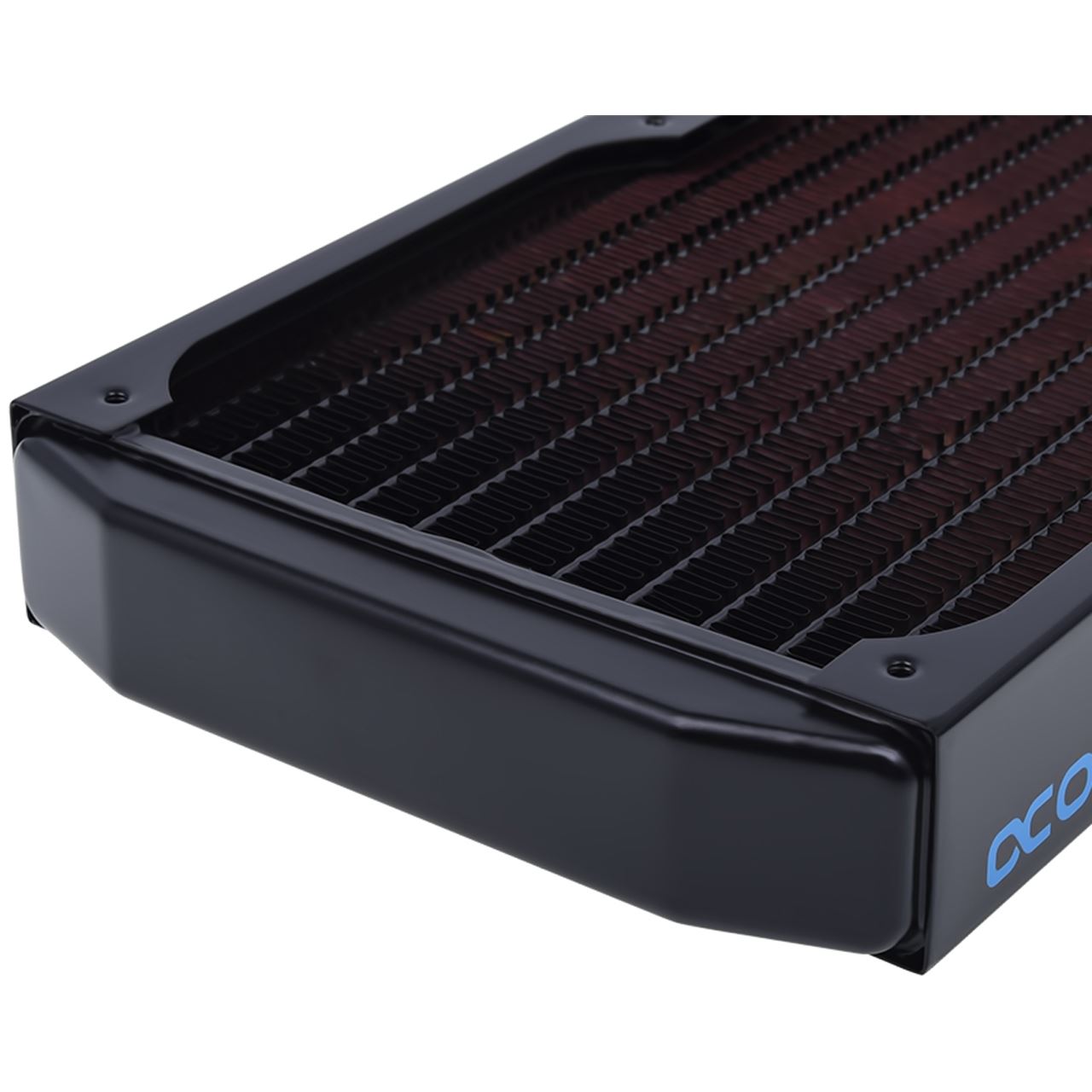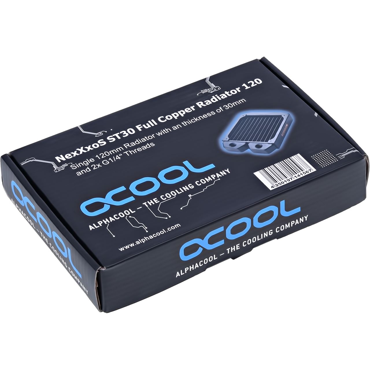 120mm-Radiator von Alphacool, Vollkupfer-Aufbau mit schwarzem Stahl-Rahmen, bis zu zwei 120-mm-Lüfter in Push/Pull-Konfiguration, 30 Millimeter Dicke und 16 FPI, 2x G1/4-Anschlüsse