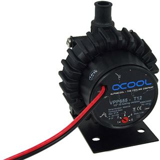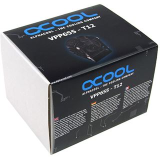 Alphacools neue Powerpumpenserie, einmalige Performance zu einem unschlagbaren Preis. Die 12V-Pumpen können einfach ans Netzteil angeschlossen werden und schon startet die Pumpe zusammen mit dem Rechner! So werden maximaler Komfort und größtmögliche Sicherheit erreicht. Diese Pumpe ist ideal für die Wasserkühlung von PCs und anderen elektronischen Komponenten geeignet. Die Gleichstrommotorpumpe ist mit einem elektronisch kommutierten sphärischen Motor ausgestattet. In einer Pumpe mit sphärischem Motor ist der einzige bewegte Teil ein sphärisch geformter Rotor, Welcher in diesem Falle auf einer Lagerkugel aus ultra-harter und verschleißfester Keramik aufliegt. Die sphärische Lagerung des Rotors bietet eine Vielzahl von Vorteilen: So ist eine Zunahme des Lagerspiels konstruktionsbedingt nicht möglich, die Pumpe wird stets gleichbleibend leise und ruhig laufen. Eine separate magnetische Schirmung ist bei dieser Pumpe ebenso nicht von Nöten. Das Kugelmotorprinzip erlaubt effizienten Betrieb bei exzellenter Performance. Alle Teile der Pumpe sind völlig korrosionsbeständig. Die Pumpe wird einfach an einem 12V Molex-Anschluss des PC-Netzteils betrieben. Die Besonderheit bei diesem Modell ist, dass Sie mit einer 1/2“ Schlauchtülle ausgestattet ist, Welche ideal für Schläuche mit einem Innendurchmesser von 13mm ist. Ein weiteres Feature befindet sich auf der Hinterseite, mit einer kleinen Drehbewegung kann die Pumpe in 5 verschiedenen Geschwindigkeitsstufen geregelt werden. Technische Details Abmessungen (BxHxT): 90 x 90 x 90mm (ohne Anschlüsse) Motor: Elektronisch kommutierter sphärischer Motor Standardspannung: 12V Gleichspannung Leistungsaufnahme: 23W Erlaubte Spannung: 8-24V Gleichspannung Druck bei 12V: 3,7m Wassersäule Maximaler Durchfluss: 350l/h Pumpmedium: Wasser, Wasser/Glykol-Gemisch Maximale Systemtemperatur: 60°C Verwandte Materialien: Rostfreier Stahl 1.4571, PPS-GF40, EPDM O-Ringe, Aluminiumoxid, Hartkohle Anschlüsse: 2x 1/2“ Schlauchtülle Spezielle Features: Regelbar in fünf Stufen Stufe 1: 1800 U/min Stufe 2: 2550 U/min Stufe 3: 3300 U/min Stufe 4: 4050 U/min Stufe 5: 4800 U/min Stromanschluss: 4 Pin Molex Lieferumfang 1x Alphacool VPP655 -T12 (1/2" Schlauchtülle) Hinweis Nicht geeignet für den Dauerbetrieb mit Flüssigkeiten die Titandioxid oder Glyzerin enthalten. Typischerweise verwenden viele Pastelfarben diese Zusätze. Datenblatt D5 Pumpe VPP655 Achtung Pumpensteuerung durch Heatmaster möglich! Heinweis Für die Pumpensteuerung durch den Heatmaster wird das Alphacool Pumpenadapterkabel (Artikel 52171) benötigt Die Montageanleitung finden Sie hier als Download Dieses Produkt wurde für Sie getestet Hardwareluxx (Userreview) xtremesystems (engl. Userreview) Freeocen Hardwarelabs Hardwaremax Coldzero (pt) (Userreview) Overclocking-PC (fr)