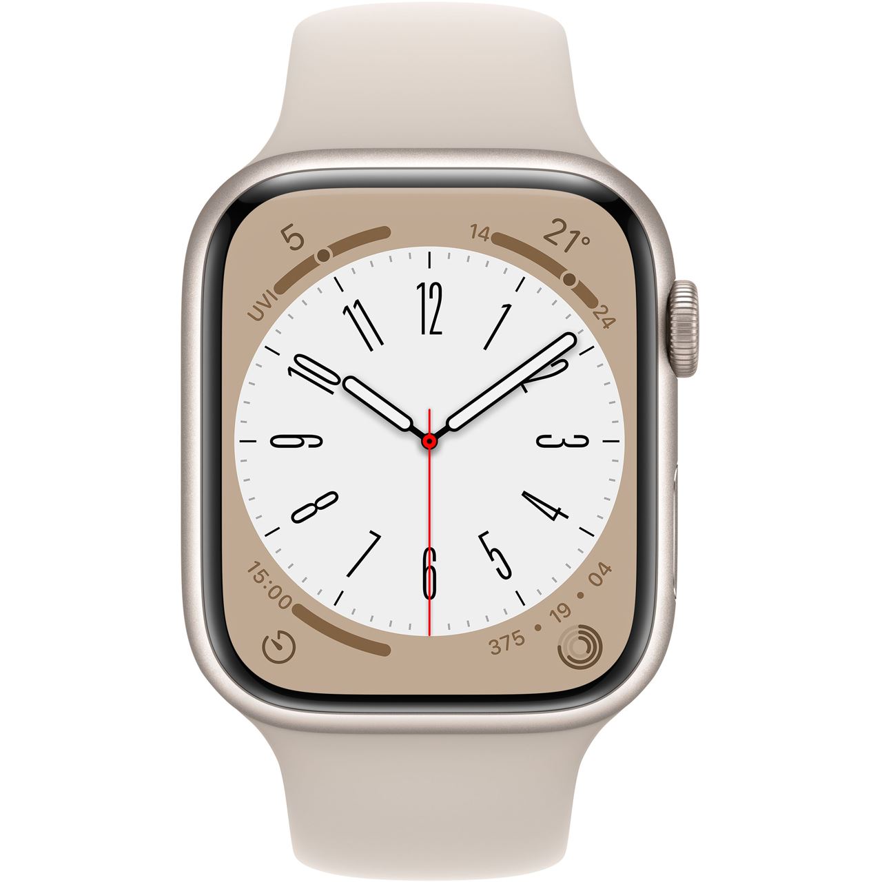Apple Watch Series 8. Bildschirmtechnologie: OLED, Display-Auflösung: 396 x 484 Pixel, Touchscreen. Flash-Speicher: 32 GB. WLAN. GPS. Gewicht: 38,8 g. Wasserdicht bis: 50 m, Armbandfarbe: Beige. Installiertes Betriebssystem: watchOS 9