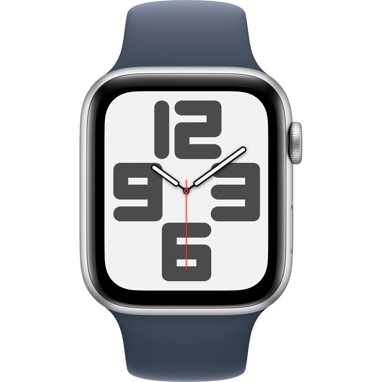 Apple Watch SE. Bildschirmtechnologie: OLED, Display-Auflösung: 368 x 448 Pixel, Touchscreen. Flash-Speicher: 32 GB. WLAN. GPS. Gewicht: 32,9 g. Wasserdicht bis: 50 m, Bandmaterial: Gummi, Armbandfarbe: Blau, Bandgröße: M/L. Installiertes Betriebssystem: watchOS 11