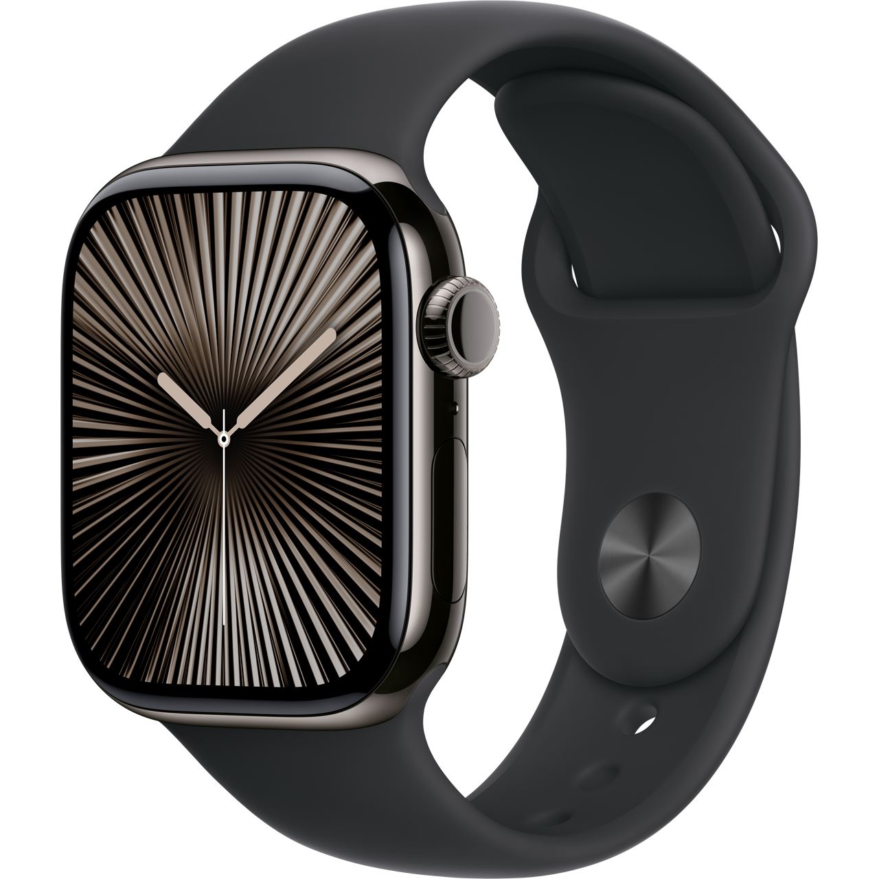 Apple Watch Series 10 . Bildschirmtechnologie: OLED, Display-Auflösung: 374 x 446 Pixel, Touchscreen. Flash-Speicher: 64 GB. WLAN. GPS. Gewicht: 34,4 g. Wasserdicht bis: 50 m, Bandmaterial: Gummi, Armbandfarbe: Schwarz, Bandgröße: M/L. Installiertes Betriebssystem: watchOS 11