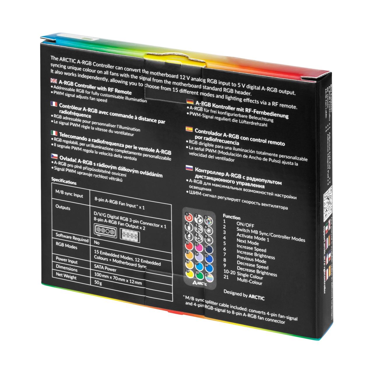 WANDEL DEIN ANALOGES RGB ZU DIGITALEM A-RGB Der ARCTIC A-RGB-Hub erlaubt es dir, 3-Pin A-RGB Produkte auch mit analogem 4-Pin RGB zu betreiben. Dabei wird das Signal umgewandelt und digital weitergeben. MIT BEILIEGENDER FERNBEDIENUNG Aufgrund der RF Remote-Unterstützung kannst du mit der beiliegenden Fernbedienung auch ohne direkten Zugriff auf oder in das Case deine Beleuchtung anpassen. VOLLE KONTROLLE AUCH OHNE RGB-FÄHIGES MAINBOARD Der A-RGB Controller funktioniert auch eigenständig und erlaubt es dir, ARCTIC A-RGB-Produkte auch ohne ein entsprechendes Motherboard zu steuern. Hierbei werden alle angeschlossenen Produkte je nach Lichtmodus und Farbe synchronisiert. MULTIPLE VERBINDUNGEN Der ARCTIC A-RGB Controller verfügt über einen standardisierten Digital RGB 3-Pin Output. Über diesen können auch Nicht-ARCTIC A-RGB-Produkte angeschlossen und vollumfänglich angesteuert werden. Die beiden 8-Pin A-RGB-Lüfter Buchsen ermöglichen dir außerdem weitere A-RGB Lüfter ins System zu integrieren und vollständig zu synchronisieren. Technical Data Packaging Width: 118 mm Height: 138 mm Length: 19 mm Weight: 0.116 kg