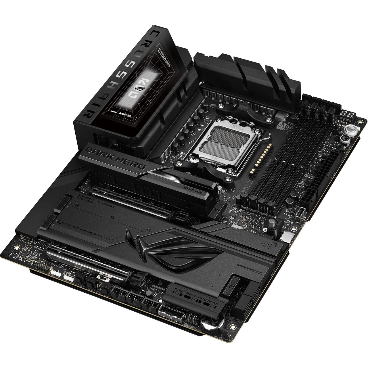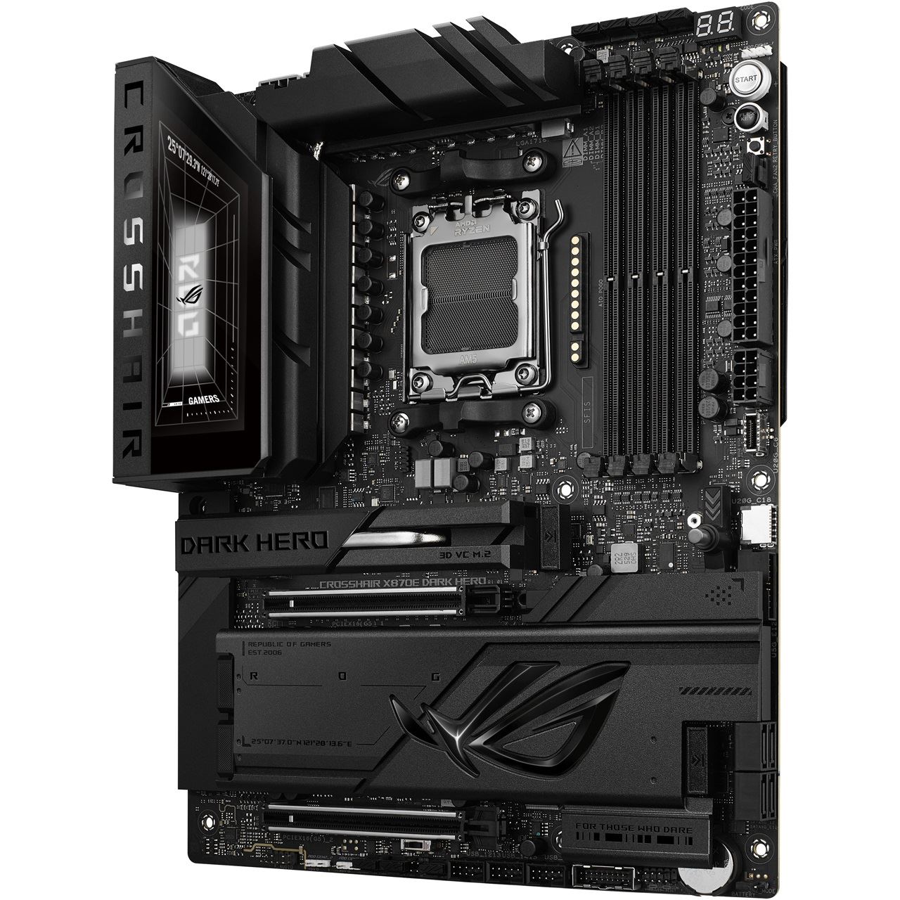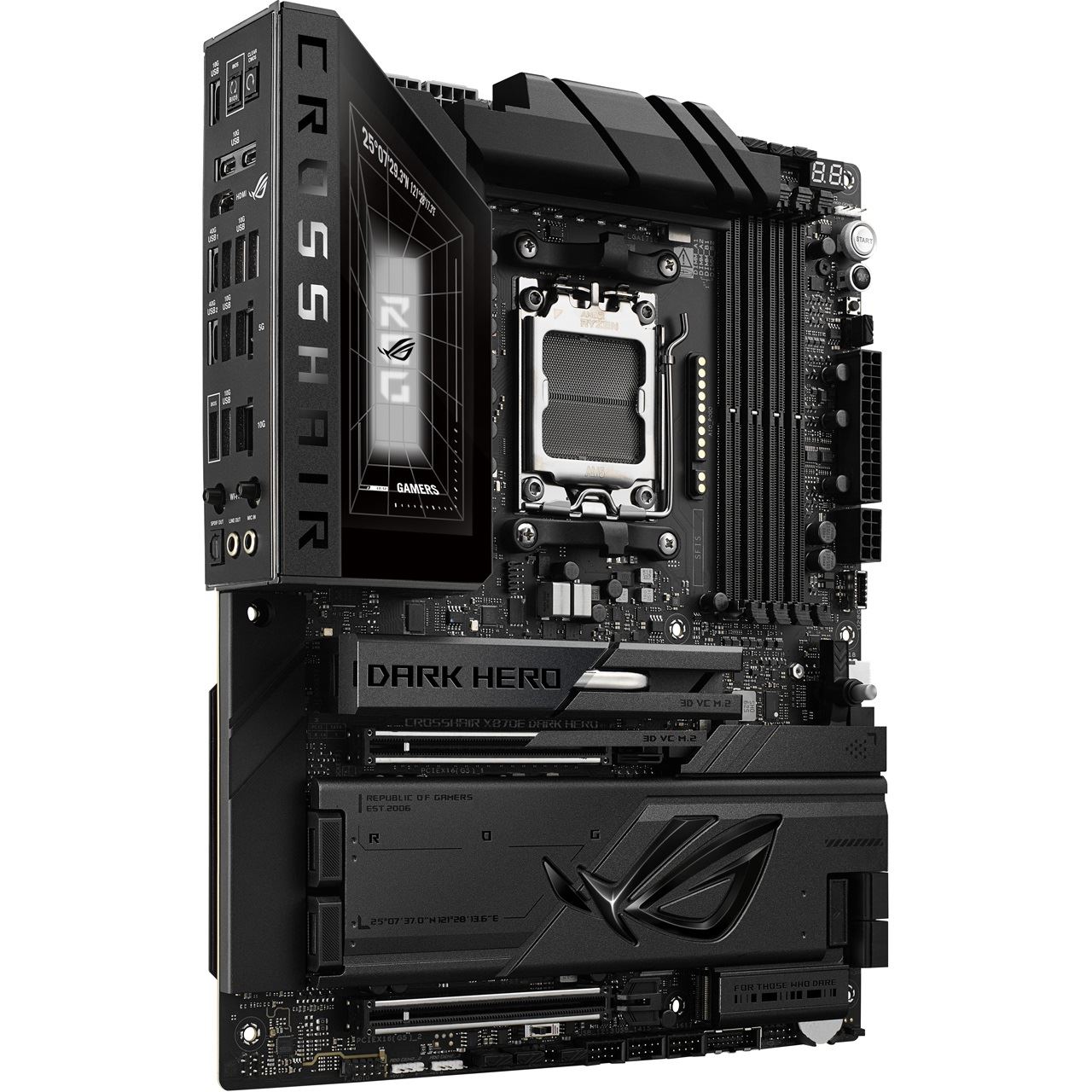 Das ROG Crosshair X870E Dark Hero ist in ein elegantes, dezentes schwarzes Design gekleidet und bietet raffinierte Leistung für High-End-Builds. Es verfügt über ein robustes 20+2+2-Power-Stage-Design, Unterstützung für Hochgeschwindigkeits-DDR5-Speicher und die neueste PCIe® 5.0-Konnektivität. Er bietet fünf integrierte M.2-SSD-Steckplätze mit Kühlkörpern, darunter ein 3D VC M.2-Kühlkörper für fortschrittliche thermische Leistung, sowie Realtek 10G-Ethernet- und USB4®-Anschlüsse für Konnektivität der nächsten Generation. ASUS-exklusive KI-Technologien und Polymo Lighting II vervollständigen die Plattform und schaffen den Spagat zwischen intelligentem Tuning und einer sauberen, hochwertigen Ästhetik.