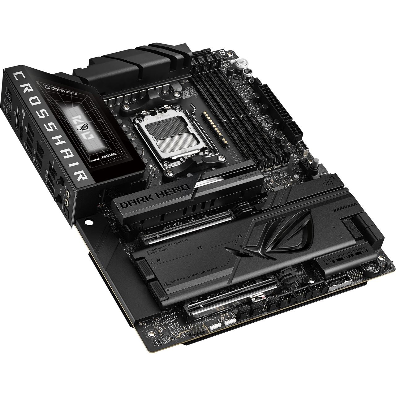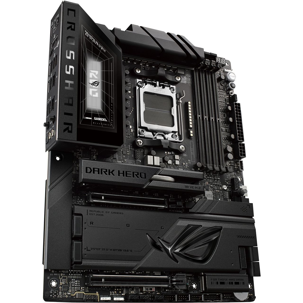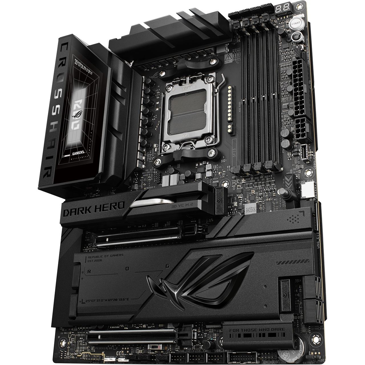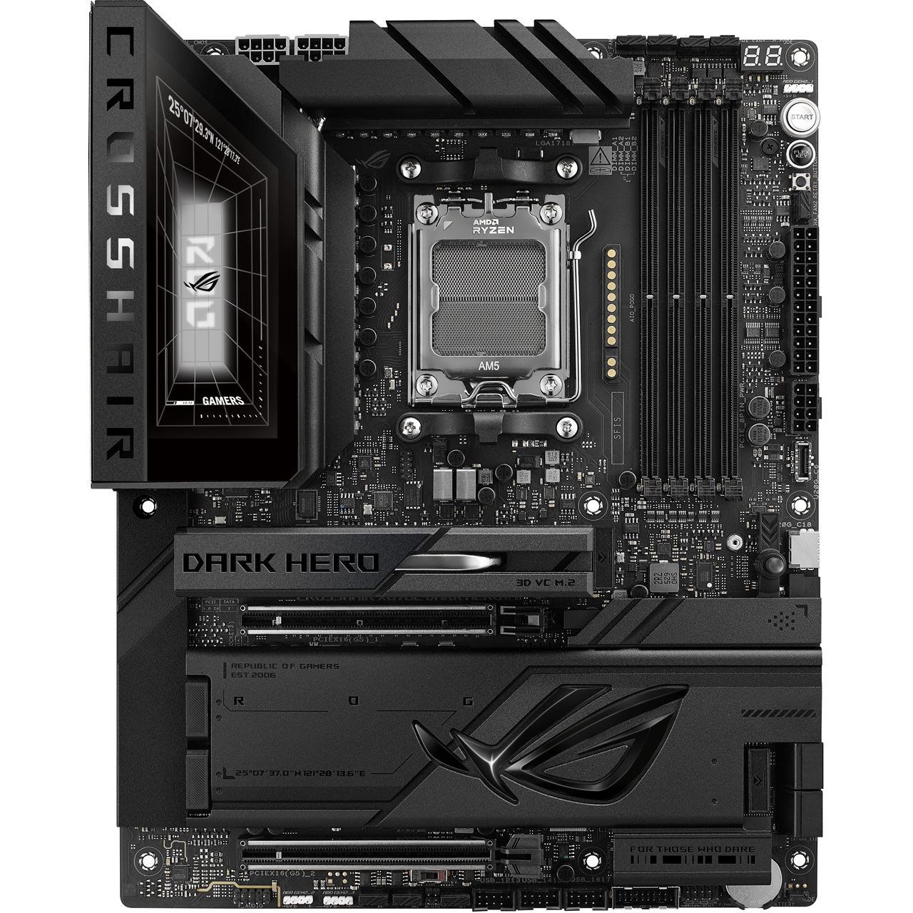 Das ROG Crosshair X870E Dark Hero ist in ein elegantes, dezentes schwarzes Design gekleidet und bietet raffinierte Leistung für High-End-Builds. Es verfügt über ein robustes 20+2+2-Power-Stage-Design, Unterstützung für Hochgeschwindigkeits-DDR5-Speicher und die neueste PCIe® 5.0-Konnektivität. Er bietet fünf integrierte M.2-SSD-Steckplätze mit Kühlkörpern, darunter ein 3D VC M.2-Kühlkörper für fortschrittliche thermische Leistung, sowie Realtek 10G-Ethernet- und USB4®-Anschlüsse für Konnektivität der nächsten Generation. ASUS-exklusive KI-Technologien und Polymo Lighting II vervollständigen die Plattform und schaffen den Spagat zwischen intelligentem Tuning und einer sauberen, hochwertigen Ästhetik.