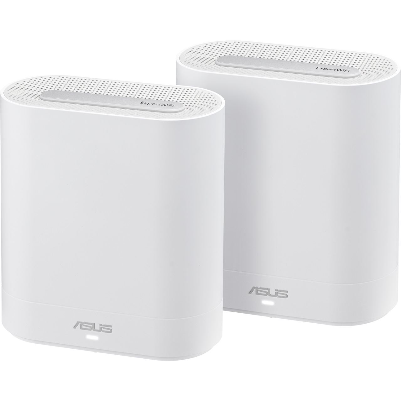 ASUS EBM68(2PK) – Expert Wifi. Produktfarbe: Weiß, Antennentyp: Intern, Produkttyp: Mesh-Router. WLAN-Band: Tri-Band (2,4 GHz / 5 GHz / 5 GHz), Top WLAN-Standard: Wi-Fi 6 (802.11ax), WLAN Datentransferrate (max.): 4804 Mbit/s. Prozessor-Taktfrequenz: 1,7 GHz, Speicherkapazität: 1000 MB, Flash-Speicher: 256 MB. AC Eingangsspannung: 110 - 240 V, AC Eingangsfrequenz: 50 - 60 Hz, Netzteil Ausgangsspannung: 12 V. Breite: 167 mm, Tiefe: 77 mm, Höhe: 186 mm