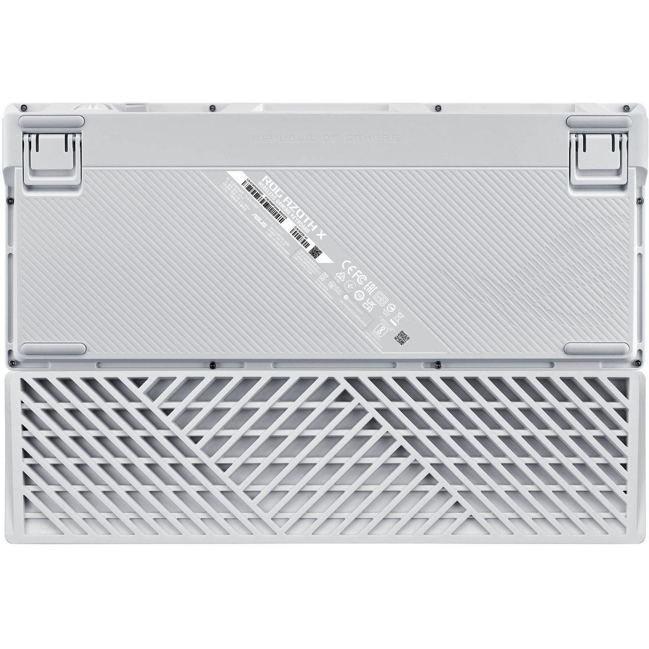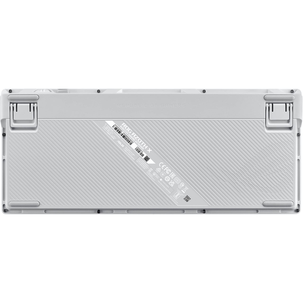 ASUS ROG Azoth X. Tastatur Formfaktor: 75%. Tastatur-Stil: Gerade. Übertragungstechnik: Verkabelt & Kabellos, Geräteschnittstelle: USB + RF Wireless + Bluetooth, Tastatur-Switch: Mechanischer Switch, Tastaturaufbau: QWERTZ. Typ der Hintergrundbeleuchtung: RGB-LED, Handgelenkauflage. Kabellänge: 2 m. Empfohlene Nutzung: Gaming. Produktfarbe: Weiß