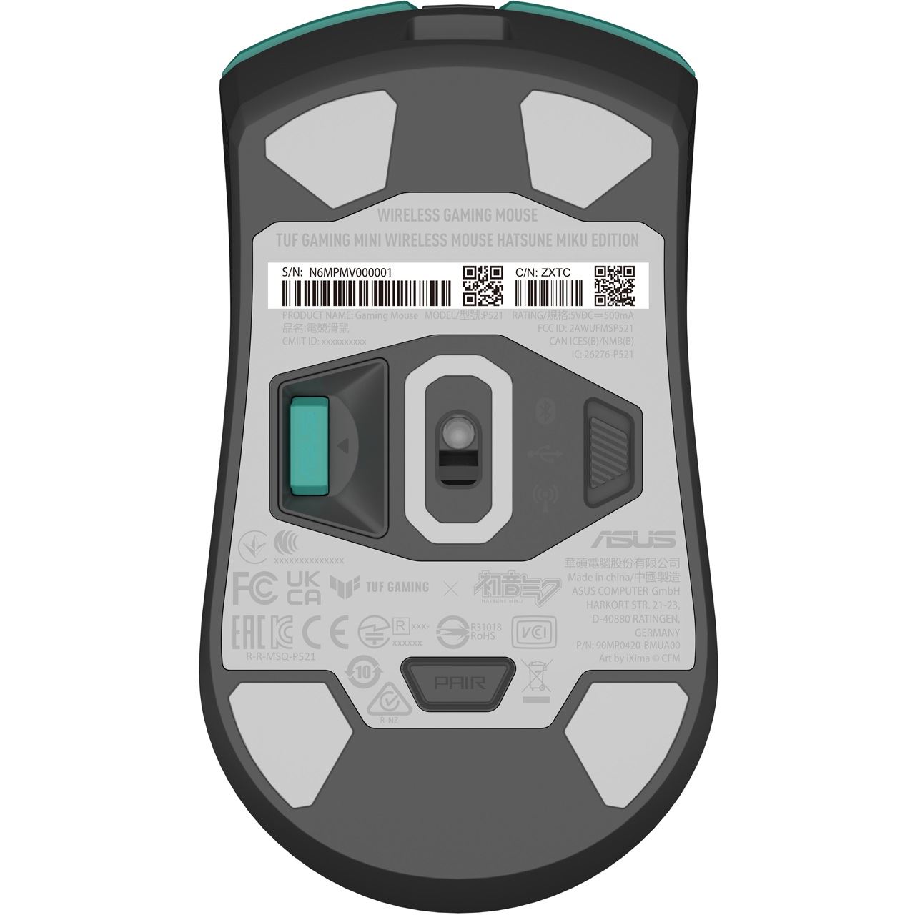 ASUS TUF Gaming Mini Wireless Mouse Hatsune Miku Edition. Formfaktor: rechts. Bewegungerfassungs Technologie: Optisch, Geräteschnittstelle: RF Wireless + Bluetooth + USB Type-A, Bewegung Auflösung: 1200 DPI, Tastentyp: Gedrückte Tasten, Knopfanzahl: 6, Scroll Typ: Rad, Beschleunigung (Max.): 35 G. Energiequelle: Batterien / Kabel. Produktfarbe: Grün, Grau, Pink