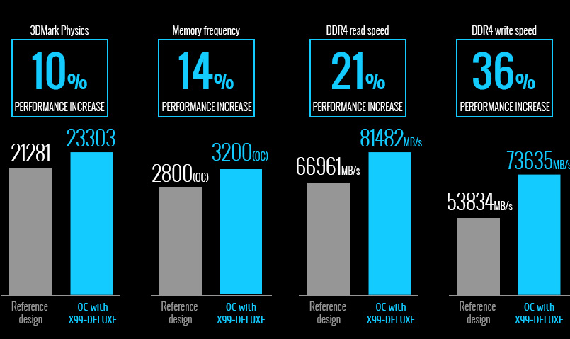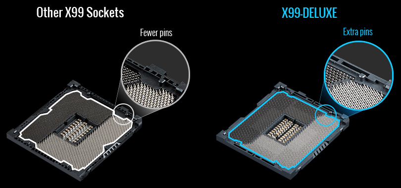 Der OC Socket von ASUS ist auf Spitzenleistung ausgelegt: Er verwendet zusätzliche Pins, um die versteckten Funktionen der Haswell E-Architektur mit einer speziellen Schaltung von ASUS zu verbinden. In Verbindung mit ASUS angepasstem UEFI-BIOS werden beim Übertakten so höhere DDR4-Speicherfrequenzen, niedrigere Latenzen und eine verbesserte Stabilität erreicht – bis hin zu extremen Anwendungsfällen mit Flüssigstickstoffkühlung. Der OC Socket ist vollständig kompatibel mit dem Sockel LGA 2011-v3 für CPUs der Haswell-E-Architektur und stellt damit die ideal Verbindung von Übertaktungsmöglichkeiten und Kompatibilität dar.