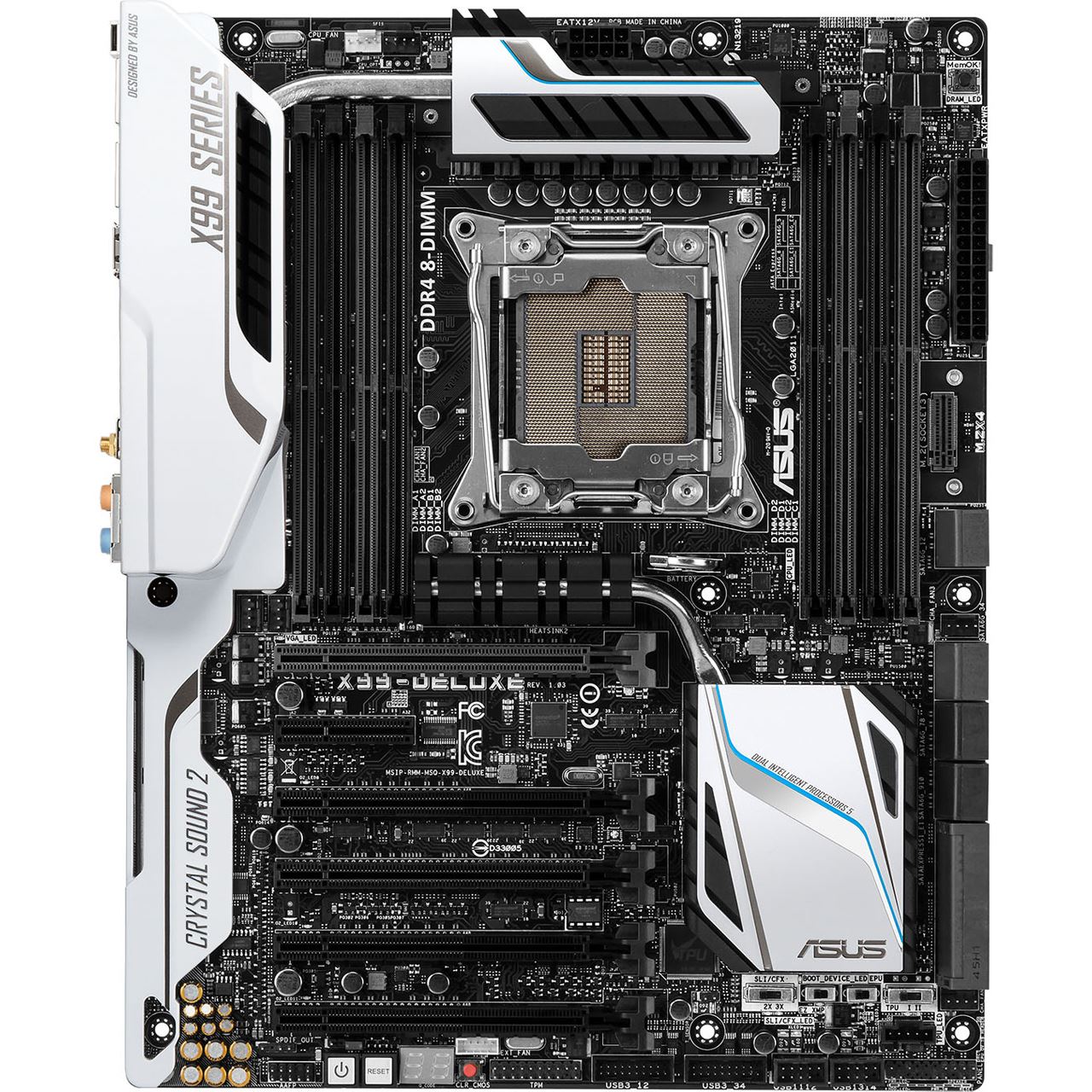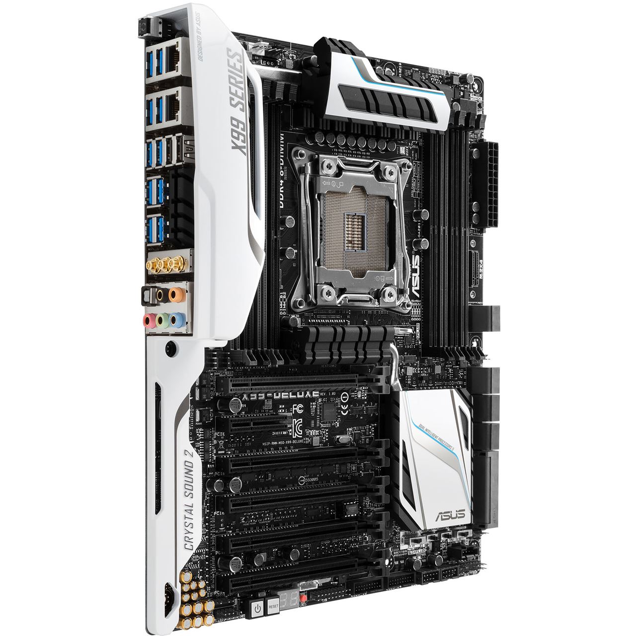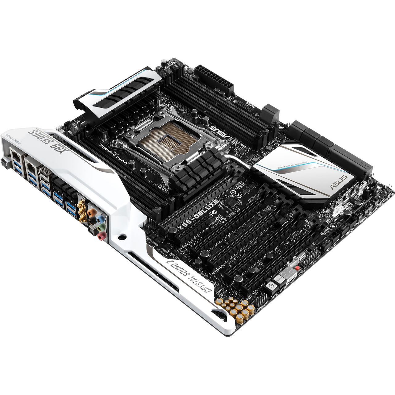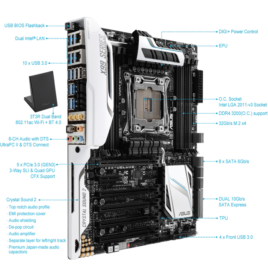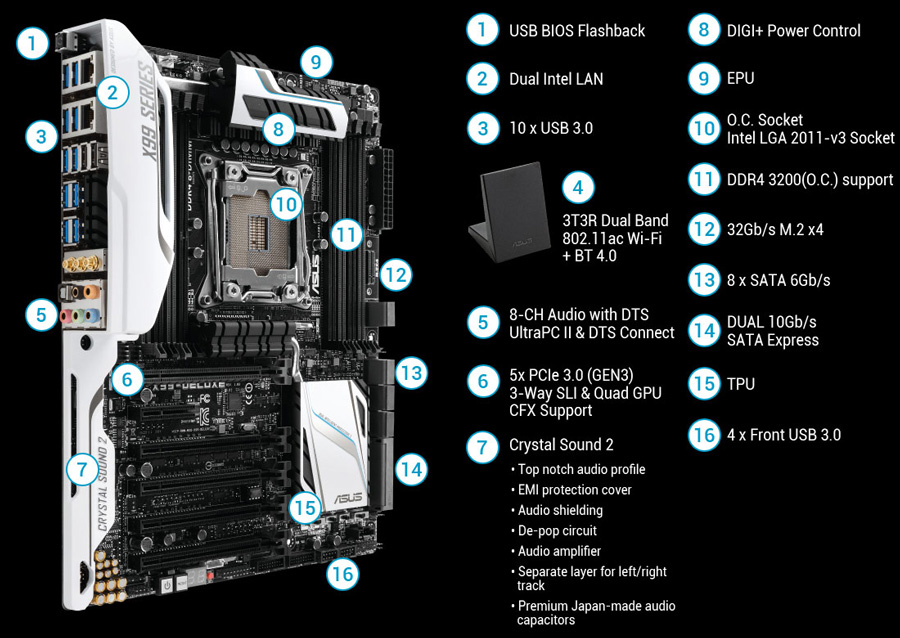 Das X99 Deluxe von ASUS, oder auch das Schweizer Messer unter den Mainboards, wurde mit unzähligen Features und Anschlüssen ausgestattet, um die höchste Performance zu erzielen. Das High-End-Mainboard kommt in einem edlen schwarz-weißen Design daher. Neben den üblichen acht RAM-Bänken für DDR4-Speicher verfügt das Board über fünf PCI-Express-x16-Steckplätze und einen PCI-Express-x4-. Es sind insgesamt 12 SATA-6Gbit/s-Anschlüsse vorhanden. Neben dem 24-poligen ATX-Stromanschluss befindet sich ein M.2-Steckplatz. Zu guter Letzt verbirgt das I/O-Panel insgesamt 12 USB-Anschlüsse, wovon 10 mit USB 3.0 kompatibel sind. Zusätzlich befinden sich hier zwei Gigabit-Ethernet-Anschlüsse sowie einige analoge und optische Ein-/Ausgänge des Onboard-Sounds. Dazu gesellen sich ein Modul für WLAN und Bluetooth 4.0.