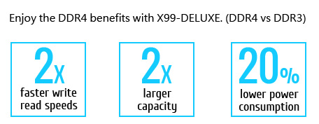 Der Intel® X99 Express-Chipsatz unterstützt Intel® Core™ i7-Prozessoren mit Sockel2011-v3. Durch serielle Punkt-zu-Punkt-Verbindungen erzielt der Chipsatz eine höhere Bandbreite und Stabilität und damit eine verbesserte Leistung. Der X99 bietet bis zu 6 USB-3.0-Anschlüsse sowie 10 SATA-Anschlüsse mit 6 Gbit/s für schnellen Datenabruf.