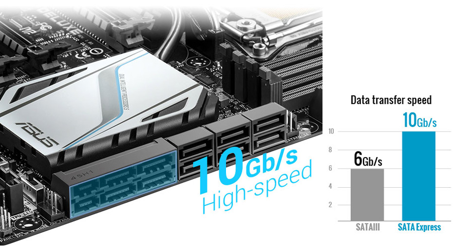 SATA Express erreicht eine Datenübertragungsrate von bis zu 10 Gbit/s mit zwei PCIe-2.0-Lanes und ist damit bereit für die Anforderungen der Zukunft. Aktuelle SSDs erreichen bis zu 550 MB/s und nähern sich damit der Obergrenze von SATA mit 6 Gbit/s. Als Verbindungsstandard der nächsten Generation macht SATA Express Ihr System bereit für die Zukunft und ist dabei rückwärtskompatibel zu bis zu zwei SATA-Laufwerken.