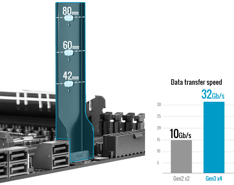 Dank der Bandbreite von PCI Express x4 3.0/2.0 unterstützt M.2 Datenübertragungsraten von bis zu 32 Gbit/s. Dies empfiehlt sich insbesondere für das Laufwerk, auf dem sich Betriebssystem bzw. Anwendungen befinden, und beschleunigt den gesamten PC bzw. die Produktivitätsanwendungen.