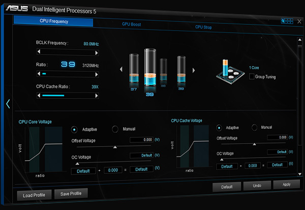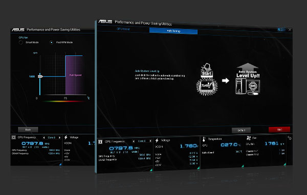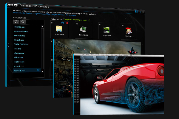 Von der anwendungsspezifischen Optimierung mit der exklusiven ASUS Turbo App profitieren Gamer und professionelle Anwender gleichermaßen. Das intuitive Tuning-Panel optimiert eine Vielzahl von Hardware-Komponenten: Es übertaktet die CPU, regelt die Lüfter, priorisiert den Datenverkehr im Netzwerk und optimiert automatisch die Audioeinstellungen.