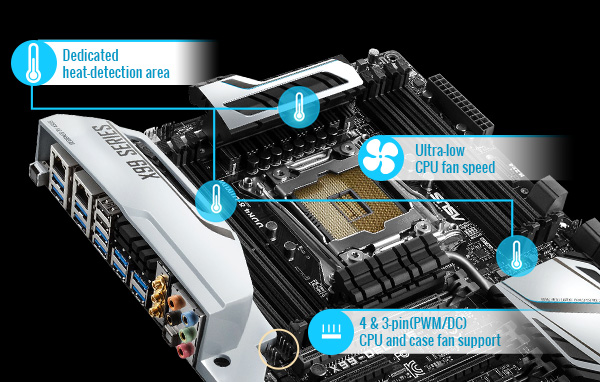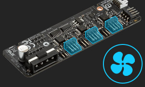 Bis zu drei Lüfter können zusätzlich angeschlossen und separat über das UEFI-BIOS oder AI Suite 3 geregelt werden. Insgesamt werden neun Lüfter unterstützt (davon zwei CPU-Lüfter und sieben Gehäuselüfter). Jeder Lüfter wird mit bis zu 12 W versorgt. Die vielfältigen Installationsmöglichkeiten sind ideal für Wasserkühlung oder eine intensive Luftkühlung in besonders leistungsstarken Systemen.